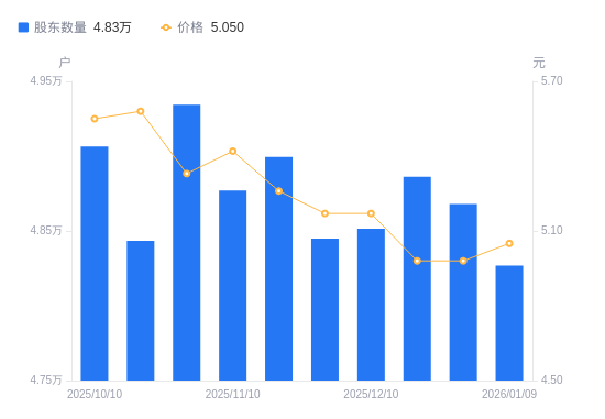 近一年(2025年1月20日至2026年1月9日),安凯客车A股股东户数从5.89万户,减低至4.83万户,降幅18.00%,区间股价下跌9.01%。