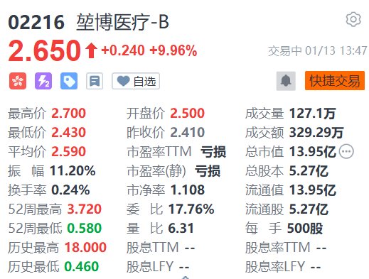 堃博医疗-B(2216.HK)涨近10%,报2.65港元,总市值13.95亿港元。堃博医疗-B公告称,旗下BroncTarget®肺部靶向去神经射频消融系统正式进入中国国家药品监督管理局的创新医疗器械特别审查程序。这标志着该产品在核心技术原创性和临床价值显著性等方面获得国家药监部门的认可。