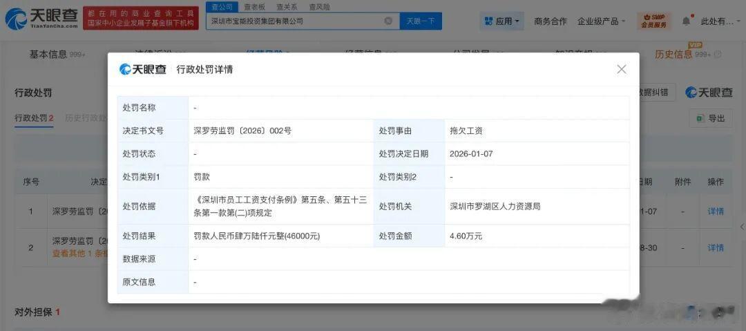 深圳市宝能投资集团有限公司因拖欠工资,被深圳市罗湖区人力资源局罚款