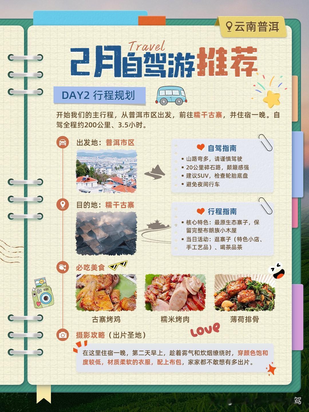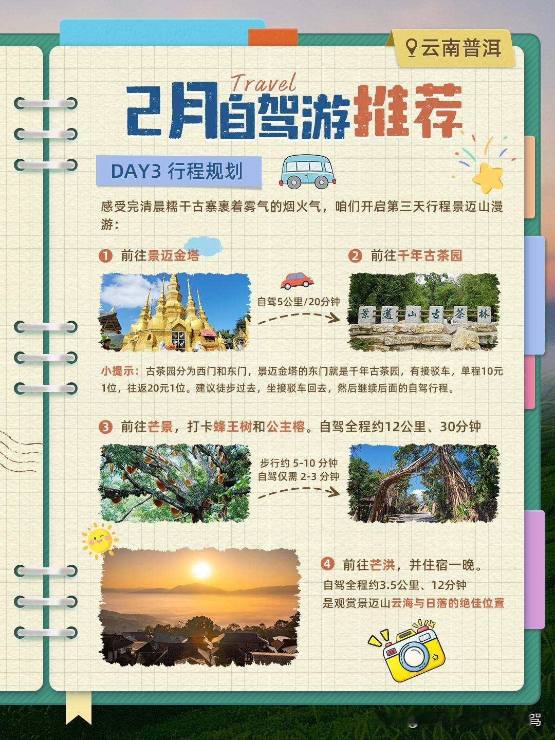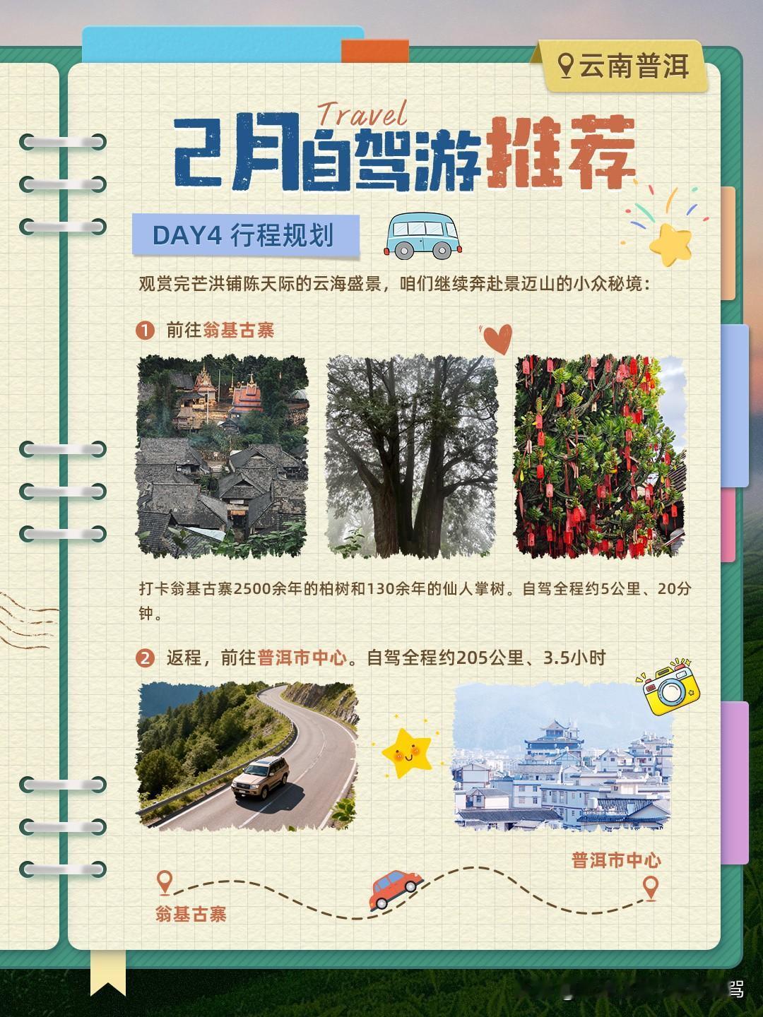 HelloHello!来咯来咯!2月份的自驾路线推荐来了!本月家家化身为文艺且忧郁的青年,向你推荐热闹与孤寂氛围并存的隐秘旅行地——云南普洱。 本次行程共4天,以下是具体行程规划~ DAY1 ①飞机抵达普洱思茅机场/火车抵达普洱站→②提前租车,寻找车辆→③前往茶马古城 注意:茶马古城、茶马古道、茶马古镇是三个地方! 茶马古道是一条爬山路,在茶马古城里面,需要单独买票;茶马古城是在茶马古道外围新建的人工古城商圈。 家家推荐18:30左右到达古城游玩,这时人多,整体氛围也更加热闹,有篝火晚会等活动。至于茶马古镇,这是另外的地方,千万不要导航错了。 不过,毕竟是人工建的小镇,期待值不用太高,主打一个来都来了,看一眼也不亏。同时,这里也作为休整行程,用来调整状态。 DAY2 开始我们的主行程,从普洱市区出发,前往糯干古寨,并住宿一晚。自驾全程约200公里、3.5小时。 注意:自驾路段弯路多,且有20公里左右的石头路,颠簸感强,租车建议选择轮胎和底盘性能较好的,避免夜间前往。 糯干古寨是本次行程中最原生态的寨子,保留了完整的布朗族小木屋。到达当日,可以逛寨子(特色小店、手工艺品),喝茶品茶。必吃美食:古寨烤鸡、薄荷排骨。 喜欢出片的朋友,这里是我给你准备的出片圣地!在这里住宿一晚,第二天早上,趁着雾气和炊烟缭绕时,穿颜色饱和度较低,材质柔软的衣服,配上布包,家家都不敢想有多出片。 DAY3 感受完清晨的糯干古寨,①前往景迈金塔。自驾全程约5公里、20分钟。 ②前往千年古茶园。古茶园分为西门和东门,景迈金塔的东门就是千年古茶园,有接驳车,单程10元1位,往返20元1位。建议徒步过去,坐接驳车回去,然后继续后面的自驾行程。 ③前往芒景,打卡蜂王树和公主榕。自驾全程约12公里、30分钟。 ④前往芒洪,并住宿一晚。自驾全程约3.5公里、12分钟。 这里是观赏景迈山云海与日落的绝佳位置。 DAY4 观赏完芒洪的云海后,①前往翁基古寨,打卡翁基古寨2500余年的柏树和130余年的仙人掌树。自驾全程约5公里、20分钟。 ②返程,前往普洱市中心。自驾全程约205公里、3.5小时。
