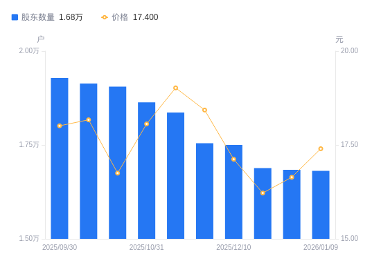 日期A股户数(户)流通A股户均持股数(股)户均持股市值(万元)2026-01-091681012519.4821.782025-12-311683612500.1420.802025-12-201688512463.8720.222025-12-101750012025.8520.592025-11-201754611994.3222.112025-11-101836611458.8021.792025-10-311863711292.1820.392025-10-201905211046.2118.502025-10-101913610997.7219.982025-09-301928210914.4519.66
