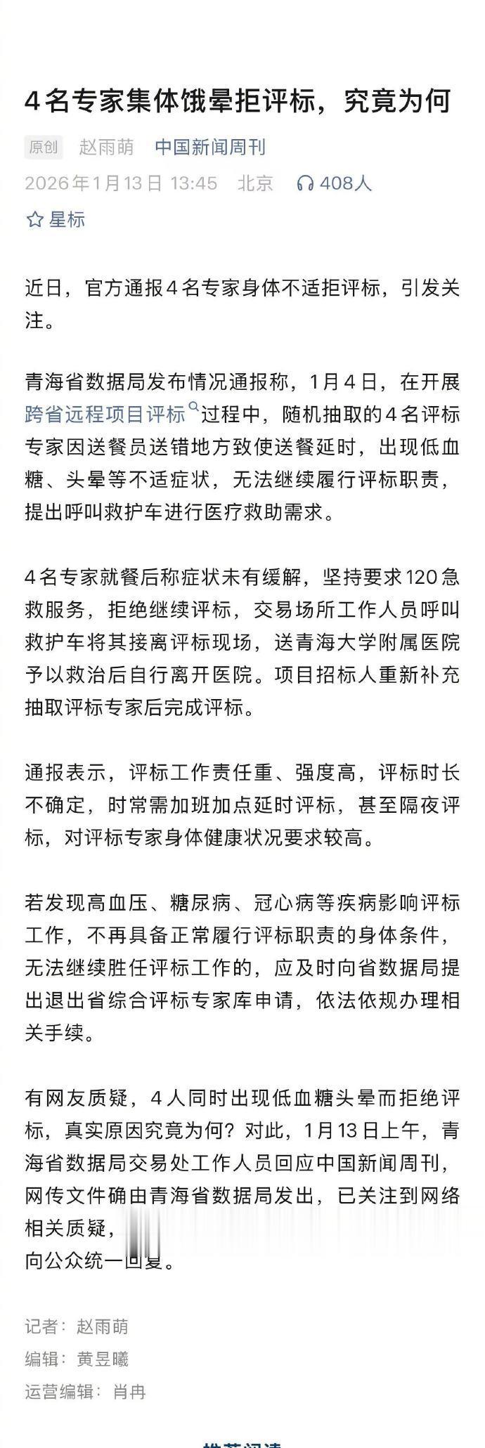 青海省数据局日前莫名其妙发了一个通报称,4名专家因饿得不适拒评标。这个通报近日发酵起来,很多网友都看不懂它,媒体也看不懂,老胡本人当然也看不懂背后的原因究竟是啥。于是出了新的疑问:青海省数据局因为啥急火火地出来澄清?“事情的背后是什么”? 老胡个人也只是“瞎猜”,大概是有哪个专家或者涉事者有什么不满意,在网上发了个 帖子,引起小范围的围观,青海官方受到网络“新舆情”的惊吓,于是抢在它大规模发酵的前头就出来“澄清”了。因为绝大多数人之前完全没听说这件事,所以看不懂通报,不知所以然。结果是莫名其妙的官方通报反而引来一波舆情。老胡此时的感觉是,这是青海省数据局自己搞出来的很典型的乌龙球。 互联网时代搞得很多人和机构“草木皆兵”,看炊烟都像“狼烟”。所以,现在经常由某个地方的官方机构对大家没听过的事情搞“澄清”。那种情况下,通报成了大家最早听说被澄清事情的初始信息源。说是“过度回应”吧,万一舆情闹大了,责任算谁的? 互联网造成了一种困境:对小范围有争议的事情不澄清,一旦闹大了,属于官方机构不作为;一有事就澄清通报,又可能把本来不是什么事的事情给搞大,反过来闹出笑柄,引火烧身。 大概谁都没有一个真正的好办法破解困局,所以最重要的可能是,大家不妨都适当放松一些,官方也不必一有基层的舆情发酵就追责,要看看是不是真有大错。还是要以错论罚,不要以舆情大小论罚。 像青海数据局近日的这个乌龙球发酵了,老胡个人认为,发酵就发酵了吧。有的时候就是舆论场没别的大事,闲的,大家就会四处搜索,嘭地就把聚焦点落到了哪个挺新鲜、有悬念、很适合围观的事情上。说到这件事,只要其中没有大的原则问题,青海省数据局被互联网如此消费一下,就当是为互联网繁荣做贡献了吧。