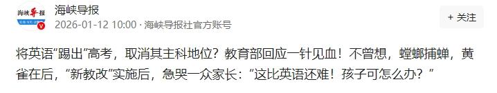 将英语“踢出”高考,取消其主科地位?教育部回应一针见血!不曾想,螳螂捕蝉,黄雀在后,“新教改”实施后,急哭一众家长:“这比英语还难!孩子可怎么办?”   这些年关于英语的风吹草动,确实不少,教育部的官方文件也明确指出,在义务教育阶段,外语的课时占比已经从过去最高的百分之十三,下调到了百分之六到八,确实是降了。   而且在一些试点地区,比如上海,小学期末甚至一度不考英语了,这些信号,让很多人觉得英语“退居二线”指日可待。   然而,大家可能忽略了一个最关键的地方:高考,在即将全面铺开的新高考“三加一加二”模式里,语文、数学、外语这三门,依然是雷打不动的全国统考科目,每门总分一百五十分,一分不少。   教育部的一系列回应和举措,翻译过来就是:英语的重要性确实需要科学地重新审视,但它作为一门帮助我们看世界的工具,其基础地位不会轻易动摇。   它不是被“踢出去”,而是从“唯一必选”变成了“多项选择之一”,学生现在可以在英、日、俄等多种外语中选一门来考。   就在我们把注意力都放在外语上的时候,一场针对我们母语——语文的深刻变革,已经静悄悄地铺开了。   这场变革的核心,就是我们老祖宗留下的瑰宝:古诗文,你可能还不知道,从前几年开始,高中语文新课标就把必背的古诗文篇目,从大家熟悉的十几篇,一口气暴增到了七十二篇。   你没听错,是七十二篇,翻了足足五倍,这还不是简单的背诵,要求是深入研读,理解背后的文化内涵。   这股风潮,更是直接吹到了小学的课堂,新版的部编本语文教材,小学一年级就开始正式接触古诗。   整个小学六年,要学习的古诗文总数达到了惊人的一百二十多篇,比以前增加了将近百分之八十,初中的古诗文占比,更是提升到了全部课文的一半以上。   教材总主编温儒敏先生说得好,增加古诗文,为的是给孩子打下“童子功”,培养语感和审美,这是“无用之大用”,是塑造一个中国人精神底色的关键。   然而,美好的蓝图落到现实中,却让无数家庭感受到了前所未有的压力,很多家长突然发现,这个“新来的”古诗文,比对付了这么多年的英语,还要难缠得多。   学英语,有相对固定的词汇、语法体系,学习路径清晰,可以通过大量的练习来提升,可是古诗文呢?那是一个浩瀚如烟海的世界。   那些生僻的字词、复杂的典故、深远的历史背景,哪一个都不是能轻易啃下的骨头,更重要的是,它需要一种难以量化的“语感”和“审美力”。   我们的孩子从小生活在现代白话文的环境里,对古文天然就有一种疏离感和隔阂感。   如果学校的教法还是停留在“逐字翻译、概括中心思想”的老一套上,那学习过程对孩子来说,简直就是一种煎熬。   于是,新的教育焦虑诞生了:家长们开始疯狂囤积国学经典,各种“大语文”、“国学启蒙”的培训班像雨后春笋一样冒出来,学费甚至比英语班还贵。   教育的内卷,只是换了一个赛道而已。 信息来源:海峡导报
