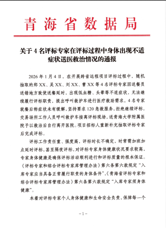 该通报称,2026年1月4日,在开展跨省远程项目评标过程中,随机抽取的郑XX、吴XX、刘XX、曹XX等4名评标专家因送餐员送错地方致使送餐延时,出现低血糖、头晕等不适症状,无法继续履行评标职责,提出呼叫救护车进行医疗救助需求,4名专家就餐后称症状未有缓解,坚持要求120急救服务,拒绝继续评标交易场所工作人员呼叫救护车接离评标现场,送青海大学附属医院予以救治后自行离开医院。项目招标人重新补充抽取评标专家后完成评标。