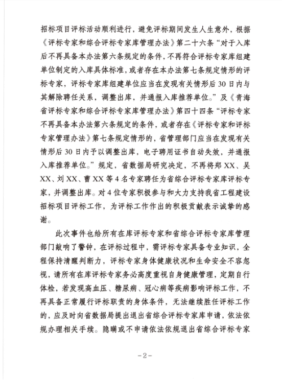 本着对评标专家个人身体健康和生命安全负责,保障每一个招标项目评标活动顺利进行,避免评标期间发生人身意外,根据《评标专家和综合评标专家库管理办法》第二十六条“对于入库后不再具备本办法第六条规定的条件,不再符合评标专家库组建单位制定的入库具体标准,或者存在本办法第七条规定情形的评标专家,评标专家库组建单位应当在发现有关情形后30日内与其解除聘任关系,调整出库,并通报入库推荐单位。”及《青海省评标专家和综合评标专家库管理办法》第四十四条“评标专家不再具备本办法第六条规定的条件,或者存在《评标专家和评标专家管理办法》第七条规定情形的,省管理部门应当在发现有关情形后30日内予以调整出库,电子聘用证书自动失效,并通报入库推荐单位。”规定,省数据局研究决定,不再将郑XX、吴XX、刘XX、曹XX等4名专家聘任为省综合评标专家库评标专家,并调整出库。对4位专家积极参与和大力支持我省工程建设招标项目评标工作,为评标工作作出的积极贡献表示诚挚的感谢。