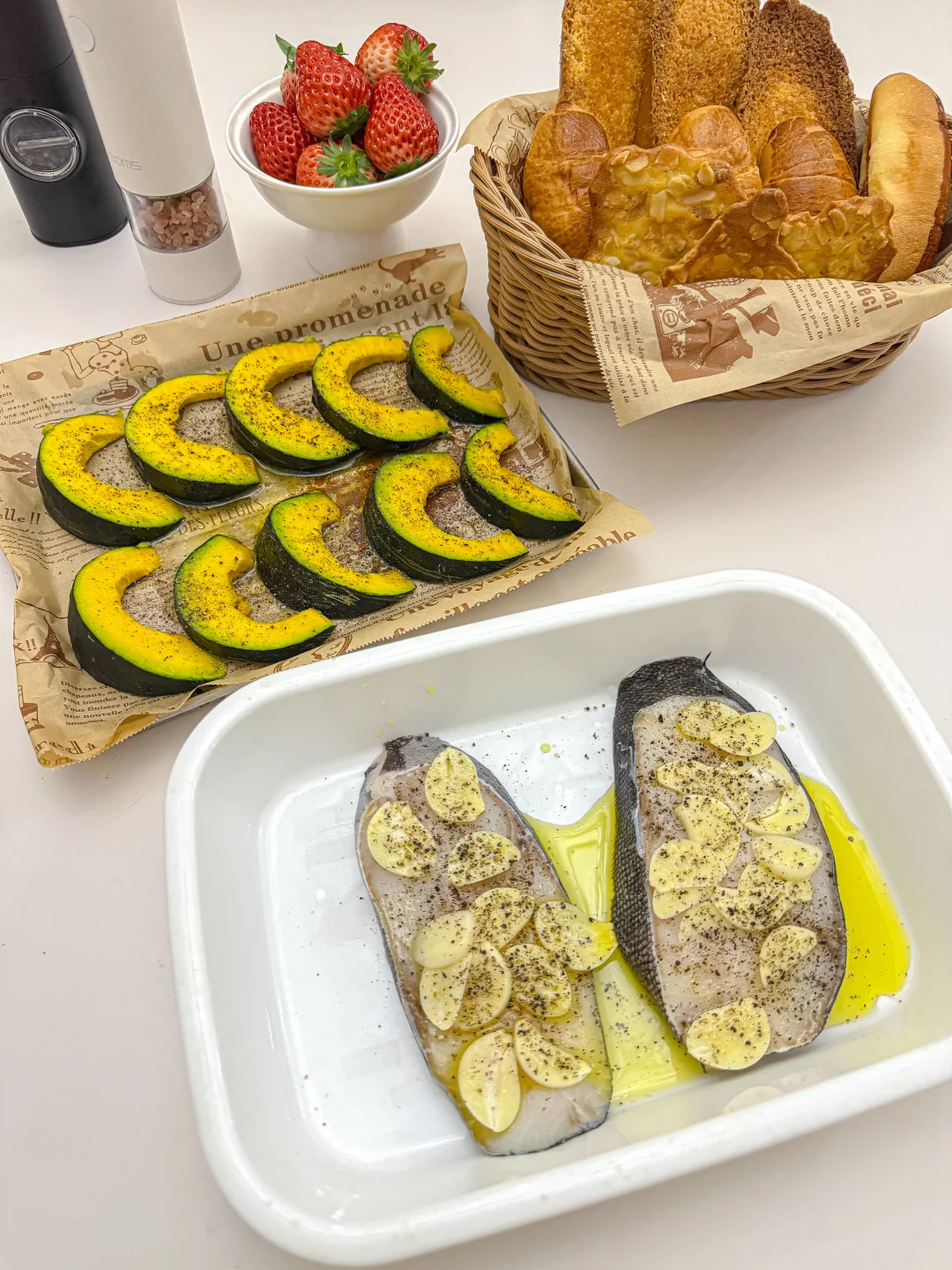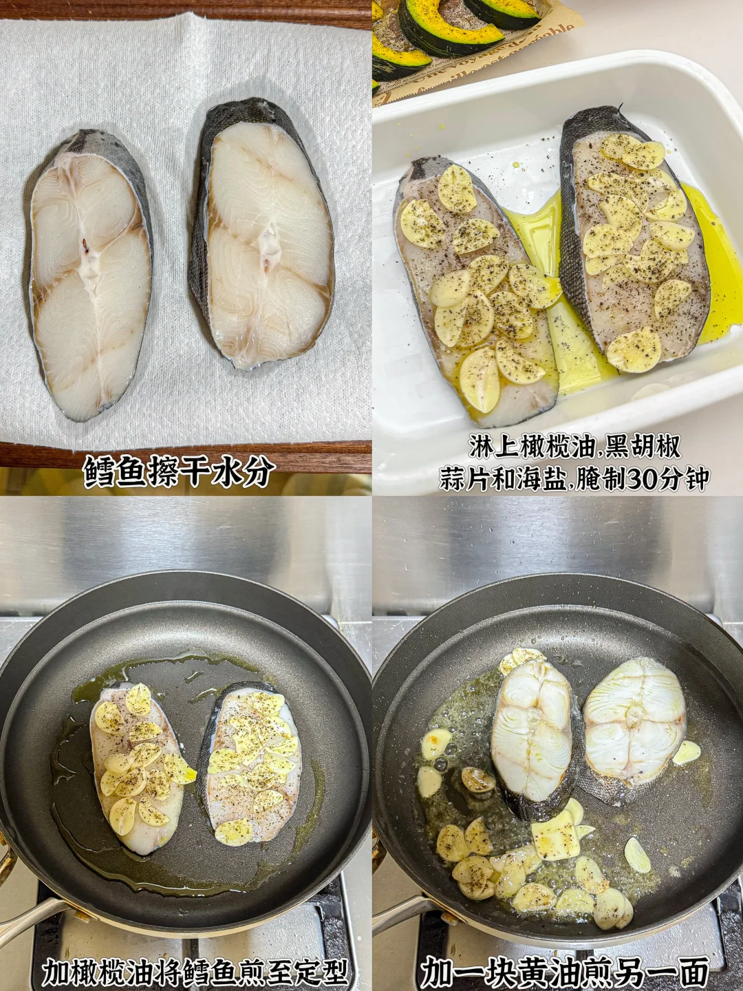1. 鳕鱼擦干,用橄榄油,蒜片、海盐、黑胡椒腌制30分钟