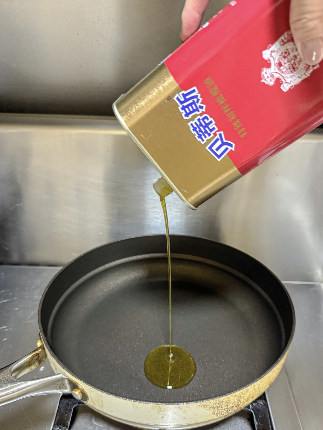 2. 锅热后倒入“贝蒂斯特级初榨橄榄油”,一面煎至定型