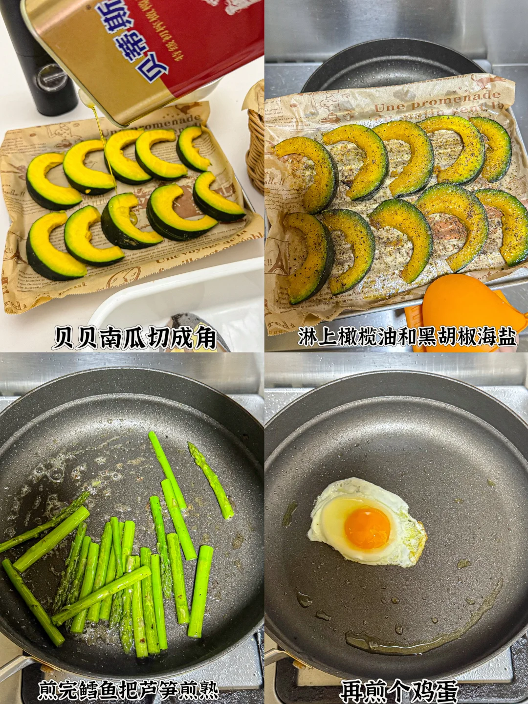 2. 用煎完鱼的锅直接煎芦笋,再煎个太阳蛋,搭配起来颜色超治愈