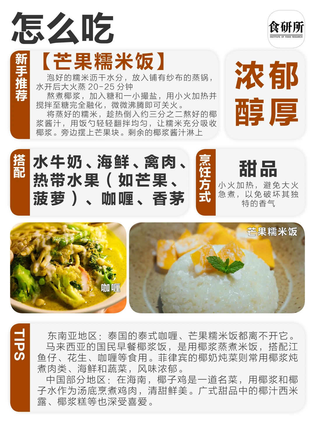 东南亚地区:这里是椰浆的“主场”。泰国的泰式咖喱、芒果糯米饭都离不开它。马来西亚的国民早餐椰浆饭(Nasi Lemak),是用椰浆蒸煮米饭,搭配江鱼仔、花生、咖喱等食用。菲律宾的椰奶炖菜(Ginataan) 则常用椰浆炖煮肉类、海鲜和蔬菜,风味浓郁。