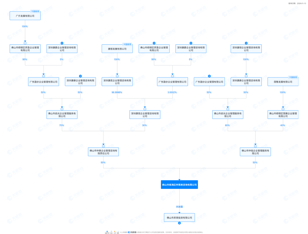 佛山昇莱由广州昇力投资、佛山市南海区仲莱美咨询有限公司(下称“南海仲莱美”)共同持有。而南海仲莱美是一家刚成立不久的公司,于2025年6月成立,碧桂园境外主体公司通过层层嵌套方式全资持有该公司。