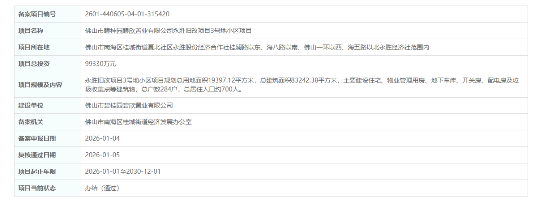近日,永胜村旧改项目3号地小区项目正式获批,建筑物主要建设为住宅、物业管理用房等,项目总投资约9.93亿元,总建面约8.32万㎡,建设单位为佛山市碧桂园碧欣置业有限公司(下称“碧欣置业”)。