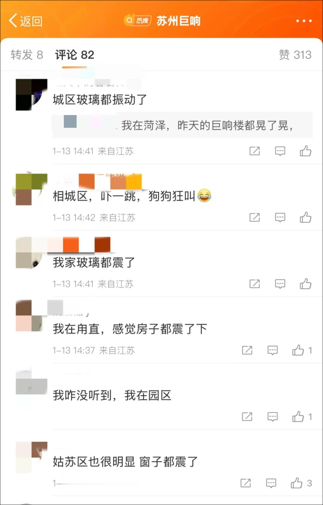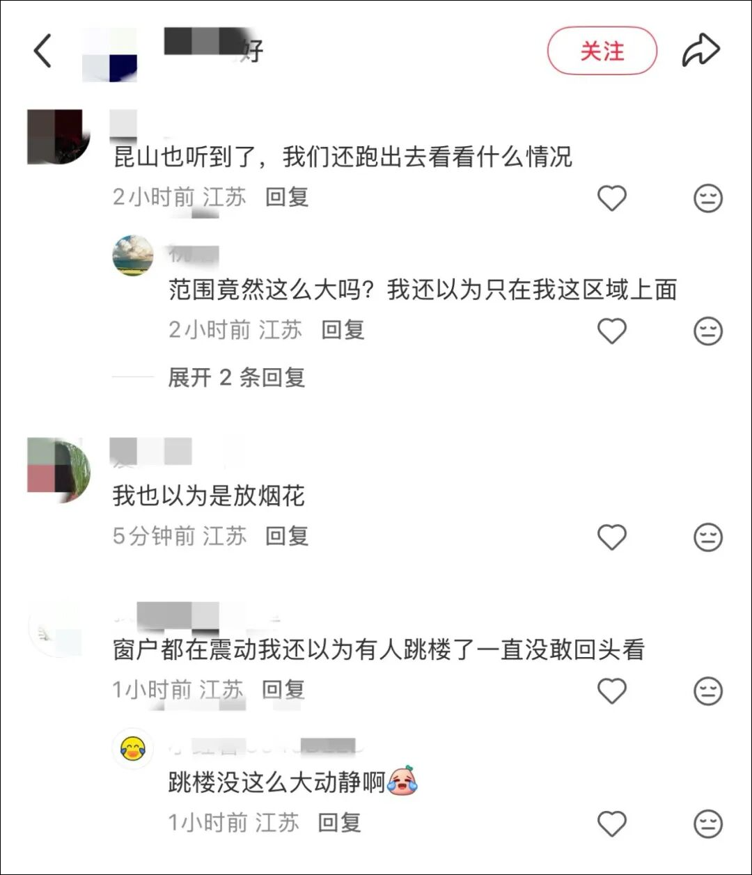 苏州吴中区居民李女士则表示,自己午睡时被巨响惊醒,“像‘炸雷’一样,我赶紧起身到客厅,发现家具轻微抖动,天花板的吊灯也晃了两下。”