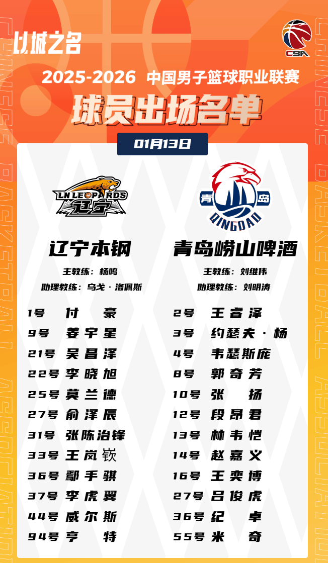 虎扑01月13日讯今晚CBA常规赛,青岛对阵辽宁的大名单已经出炉。