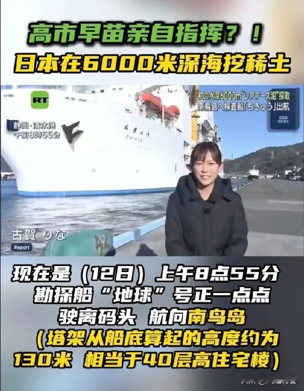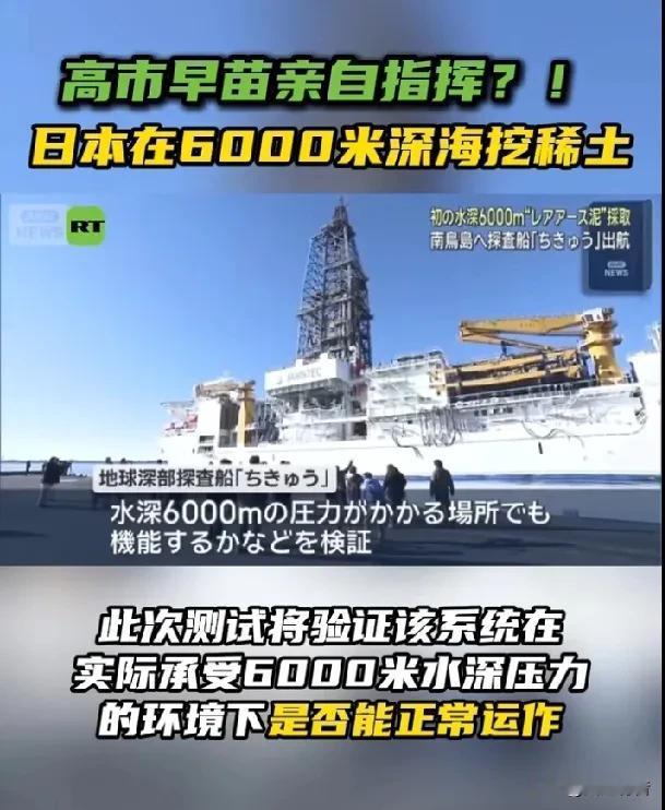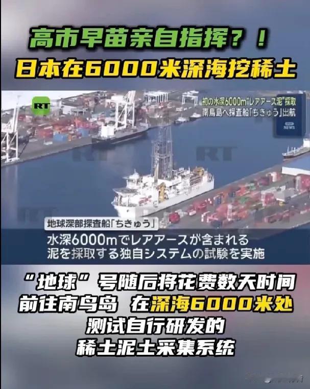高市早苗亲自指挥到6000米深海挖稀土? 据《今日俄罗斯》援引全日本新闻网(ANN NEWS)1月12日消息,探查船“地球”号已从静冈县清水港出航,前往南鸟岛周边海域,在水深6000米处对其自行研发的稀土泥土采集系统进行测试,重点验证该系统在水深6000米的高压环境下是否能正常运作。 该任务属于由高市早苗首相直接领导的内阁府所推进的“战略性创新推进计划(SIP)”。项目总监石井正一表示:“我们希望攻克‘实现全球首次从6000米深的海底连续提取稀土泥’这一重大课题。” 此前据路透社报道,一艘日本采矿船于当天启程前往一处偏远的珊瑚环礁,勘探富含稀土的泥浆。这是日本为减少对中国关键矿产依赖、应对中国收紧供应所采取的措施之一。 报道称,这艘试验船将在东京东南约1900公里的南鸟岛附近执行为期一个月的任务,这将是全球首次尝试将含有稀土的海底淤泥从海底6公里处持续运输至船上。 1月6日,中国商务部宣布,禁止所有两用物项对日本军事用户、军事用途,以及一切有助于提升日本军事实力的其他最终用户用途出口。1月11日,日本首相高市早苗表示,中国决定对日本两用物项实施管制是不可接受的。