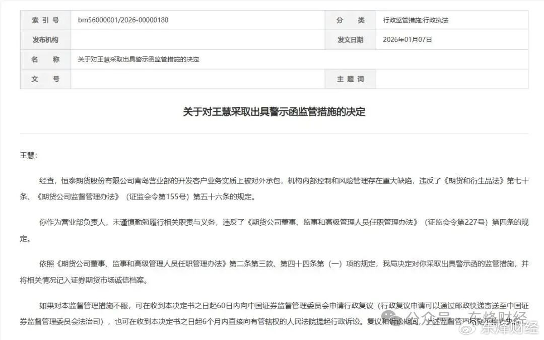 处罚决定显示,恒泰期货青岛营业部的开发客户业务实质上被对外承包,机构内部控制和风险管理存在重大缺陷,违反了《期货和衍生品法》《期货公司监督管理办法》相关规定,被处以暂停营业部期货经纪业务新开户三个月的处罚。营业部负责人王慧因未谨慎勤勉履行相关职责与义务,被采取出具警示函的监管措施。