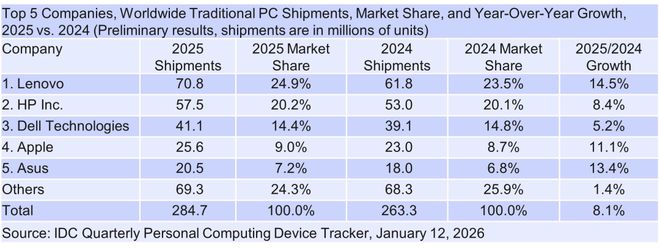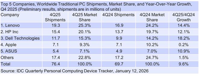 IT之家注意到,2025年第四季度,联想出货1930万台排名第一,同比增长14.4%;惠普出货1540万台,同比增长12.1%。戴尔以18.2%的增速位居前三名之首,出货量为1170万台;苹果该季度的Mac出货量为710万台,与去年同期基本持平;华硕出货量为540万台,同比增长10.9%。