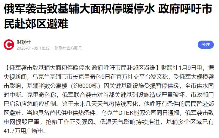这一次乌克兰真的是挺不住了,他倒在了第4个冬天。最新消息,基辅城的市长克里琴科,已经开始号召市民,离开这座城市。目前基辅城大量的城区,已经失去了基本的城市功能。   1月9日凌晨,俄军发动的大规模空袭,36枚导弹裹挟着242架无人机呼啸而至,其中不乏号称难以拦截的“榛树”高超音速导弹,精准锁定了基辅的能源与供水核心设施。   空袭过后,基辅的供电供水系统彻底瘫痪,半数以上的公寓楼——足足6000栋建筑失去了集中供暖,41.7万用户陷入黑暗之中,全城供水同步中断。   更雪上加霜的是,当时的基辅气温已跌至零下10摄氏度,部分区域甚至低至零下20摄氏度,严寒与断供形成双重绞杀,让市民的生存陷入绝境。   市政部门并非没有努力,抢修人员穿着厚重的工装在寒风中争分夺秒,可俄军的打击毫无停歇之意,往往刚架起抢修工具,防空警报就再度响起,只能被迫扔下设备躲进防空洞,抢修工作一次次半途而废,恢复城市功能变得遥遥无期。   如今的基辅街头,随处可见拖着行李箱奔波的身影,他们要么前往郊区投奔有独立供暖的亲友,要么在超市前排起长队抢购熟食和瓶装水,不少人甚至挤在超市的应急充电设备前,争抢着给家人报平安的机会。   克里琴科虽然开放了1200个临时避难所,但里面早已人满为患,大家裹着厚厚的衣物排队领取热食,场面狼狈又心酸。   基辅的困境并非一日之寒,从2025年8月开始,俄军对基辅的空袭强度就暴增了十几倍,一个月内发射的无人机数量高达6297架,单日最高逼近400架,饱和式的打击让城市基础设施反复受损,早已不堪重负。而外部援助的掉链子,更让乌克兰陷入孤立无援的境地。   2026年1月5日,特朗普政府宣布彻底停止对乌一切援助,原本承诺的8亿美元军事援助被直接搁置;欧盟虽承诺提供贷款,但27个成员国中仍有3个持保留态度,资金要靠共同举债筹集,最早4月才能拨付,完全是远水解不了近渴。   没有了外部的物资与资金支撑,乌克兰的抵抗力量也在不断消耗,大量军人逃离部队,前线防线出现巨大缺口,后方工业因断电纷纷停产,经济濒临崩溃,整个国家的运转都陷入了停滞。   前三个冬天,乌克兰还能靠着外部援助勉强修复设施、维持基本运转,可到了第四个冬天,持续的战争早已耗尽了这个国家的人力、物力和财力。   克里琴科号召市民撤离,并非放弃抵抗,而是在万般无奈下的务实选择——当一座城市连基本的水电暖都无法保障,连平民的生命安全都难以维系,坚守便失去了最根本的意义。
