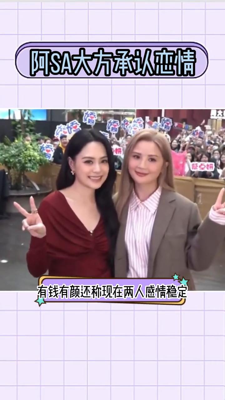 阿SA大方承认恋情。 姐弟恋的时代来了,43岁阿SA公开恋情,男友是小她10岁的健身教练。出席活动被问绯闻男友时,大方回应:"可以删去绯闻两个字",有钱有颜还称现在两人感情稳定,觉得开心便可以。每段感情都大方回应,确实谈恋爱也只是图个开心。