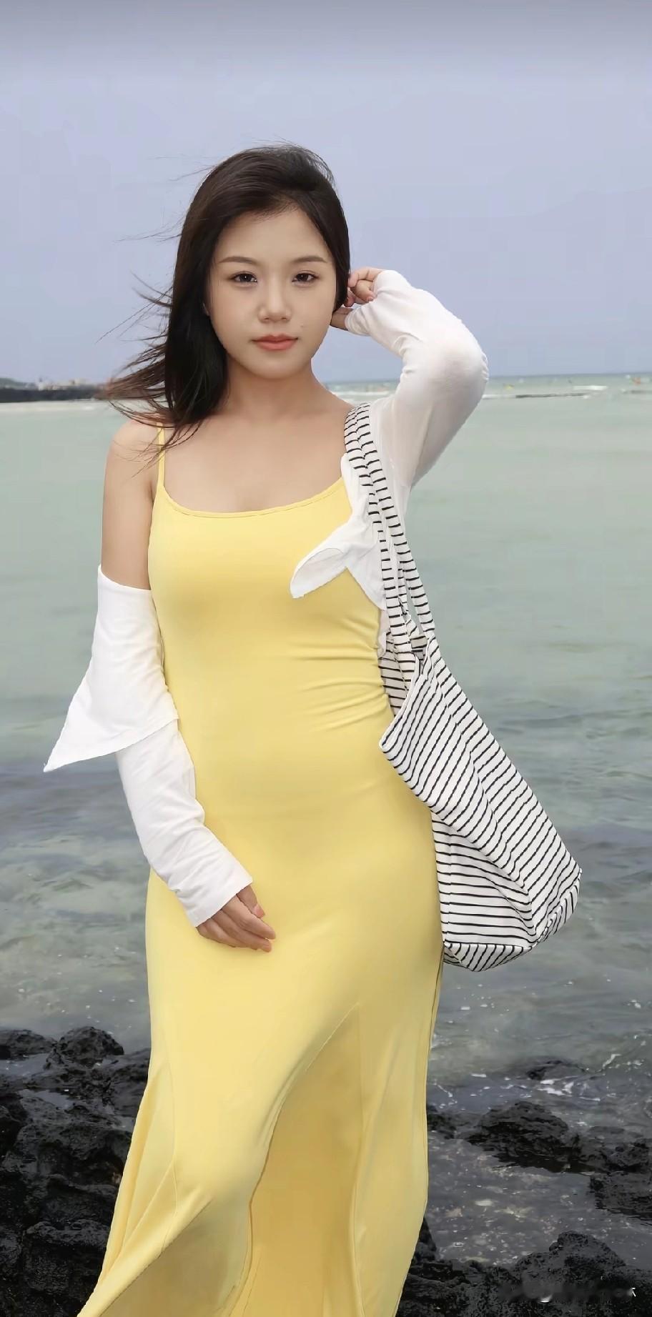 黄色连衣裙搭配条纹外套,清新自然!