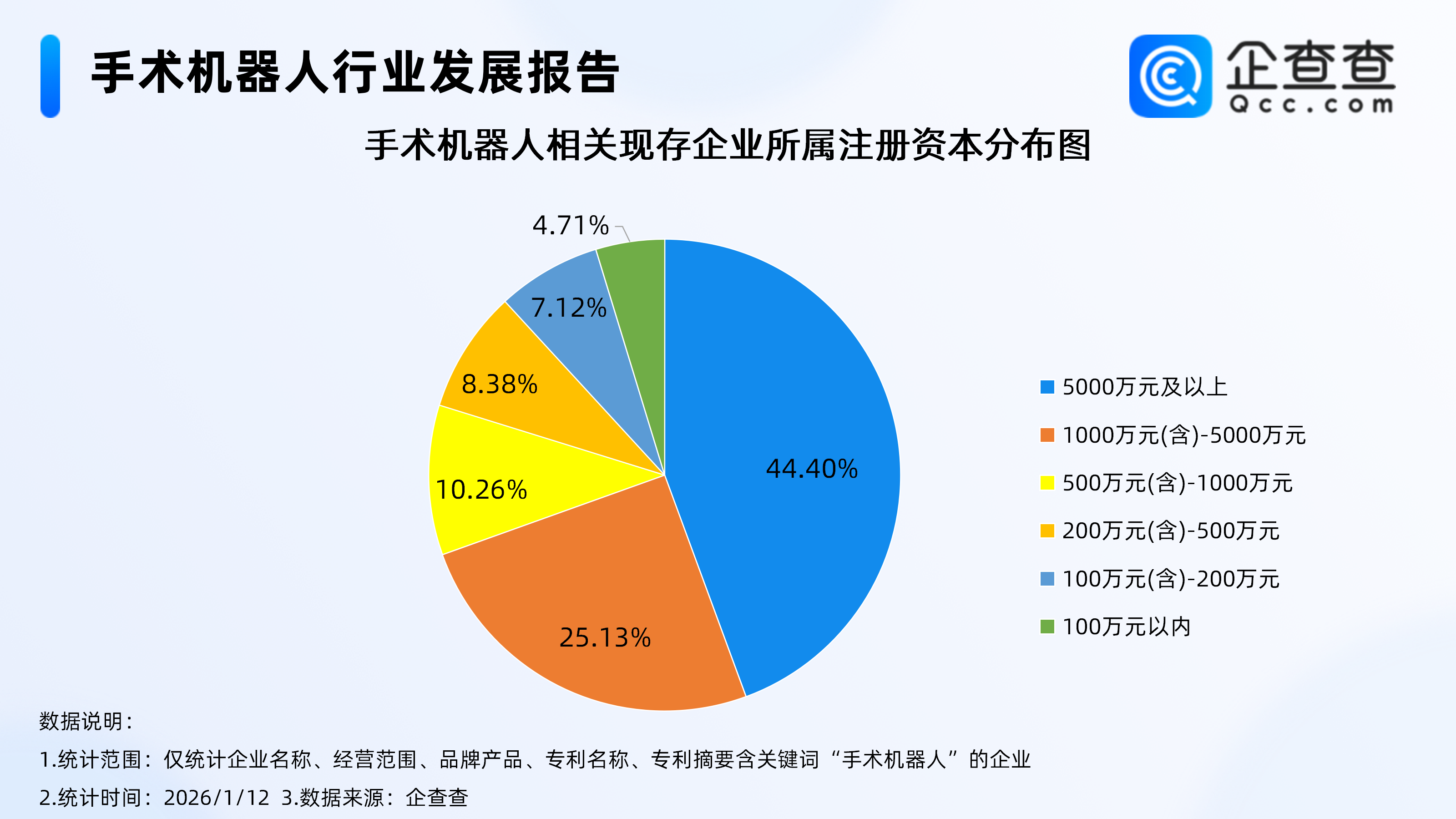 企查查数据显示,注册资本方面,国内手术机器人相关现存企业中,近7成相关企业注册资本为千万元级别,超4成相关企业注册资本在5000万元及以上,占比达44.4%。