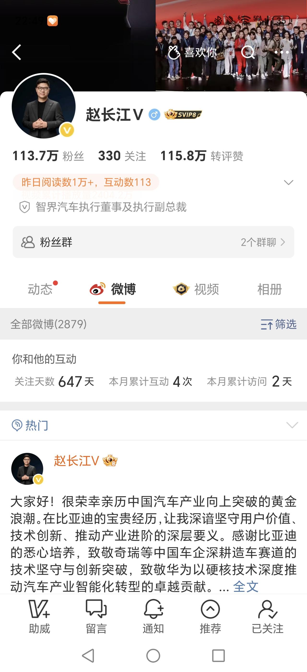 原腾势汽车总经理赵长江今日终于官宣了其下一站——智界汽车。 微博认证显示,长江总的新职位为智界汽车执行董事及执行副总裁。 长江总此前带领焕新的腾势品牌凭借腾势D9一款车型,成功出圈,跻身主流汽车品牌。 未来,腾势D9的成功经验能不能复刻到智界的全新MPV车型V9上呢?我们拭目以待! 祝长江总在新岗位上能再创辉煌[碰拳]