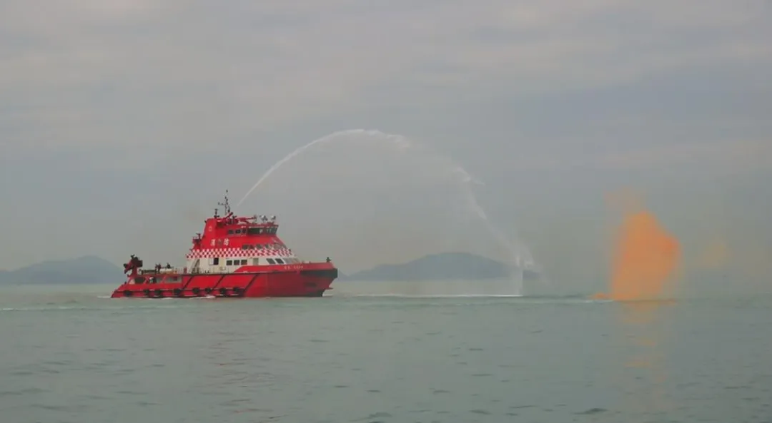 消防处灭火轮模拟海上灭火(深圳卫视直新闻驻港记者杨振华/摄)