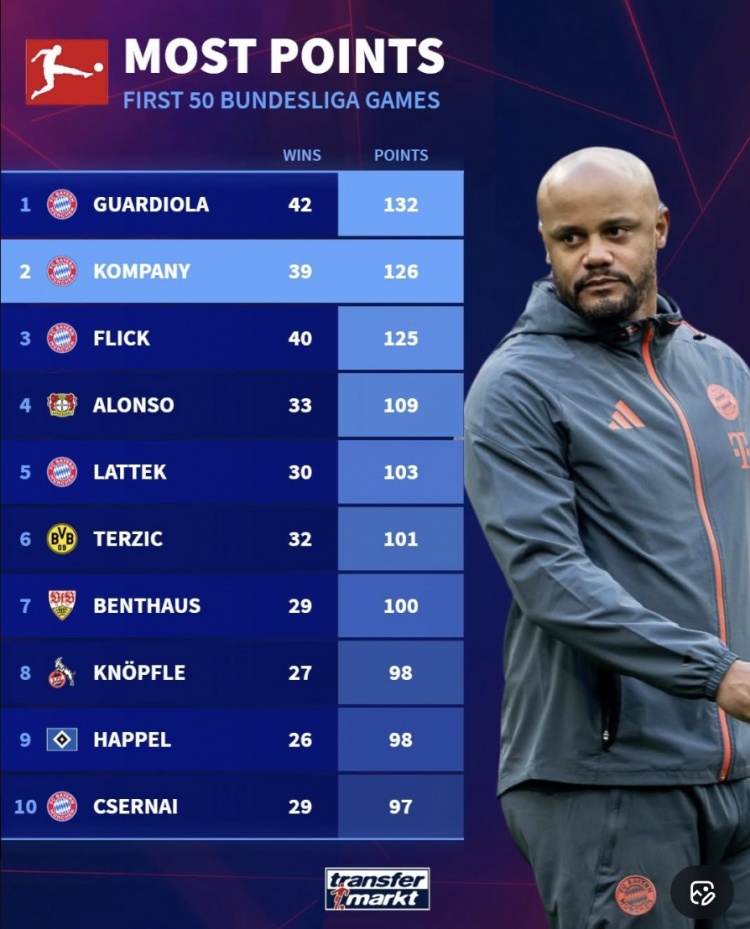孔帕尼的前50场德甲取得了39场胜利,一共拿到了126个积分;排名第一的是瓜迪奥拉,瓜帅前50场德甲取得42场胜利拿到了132分。