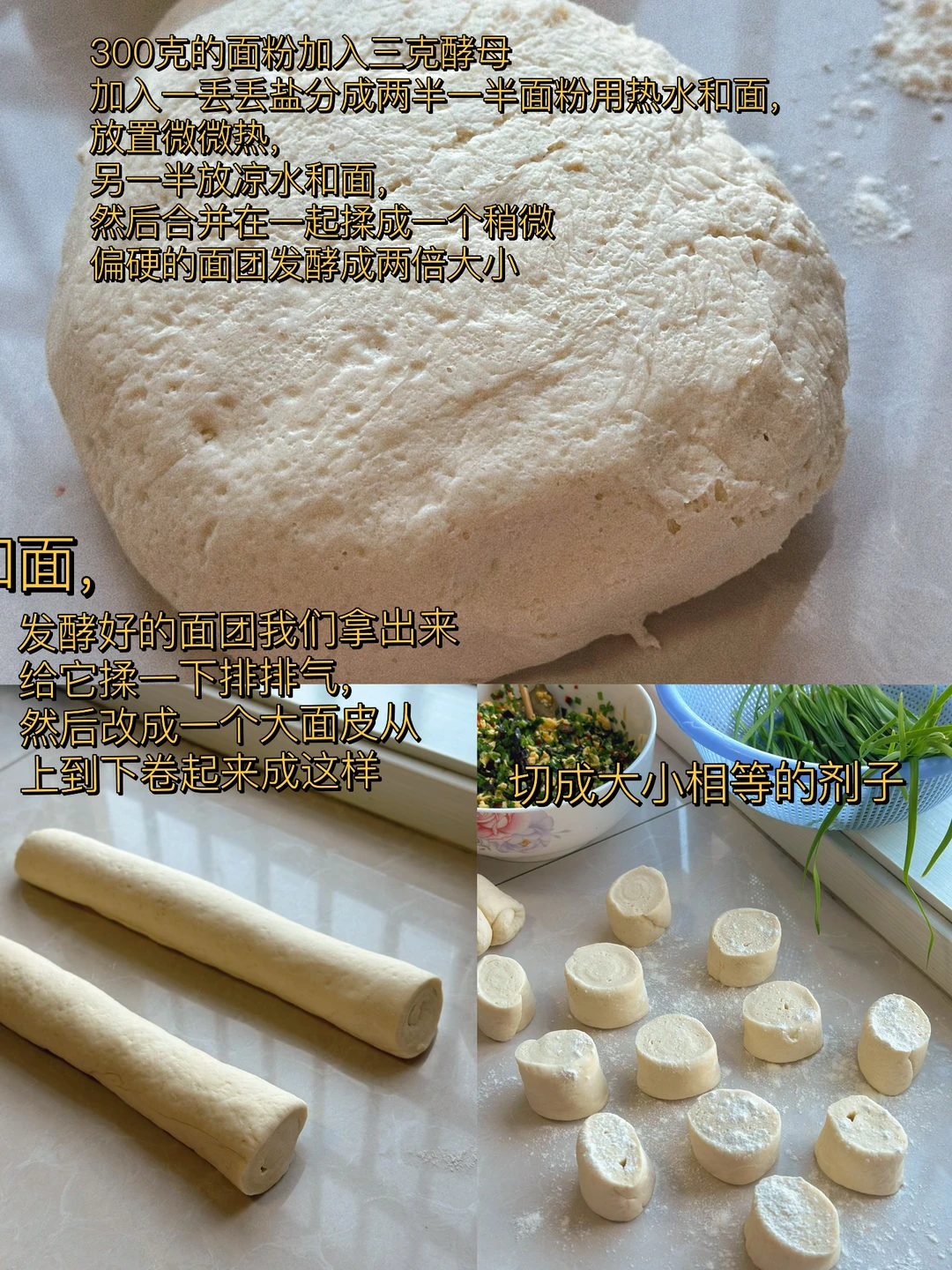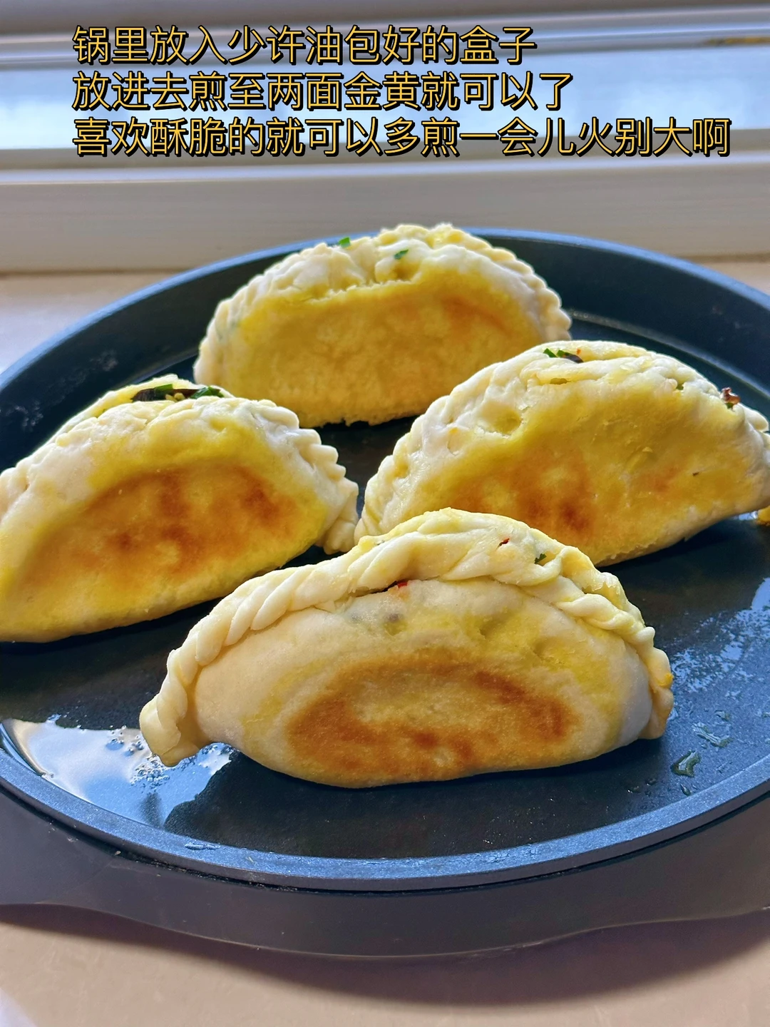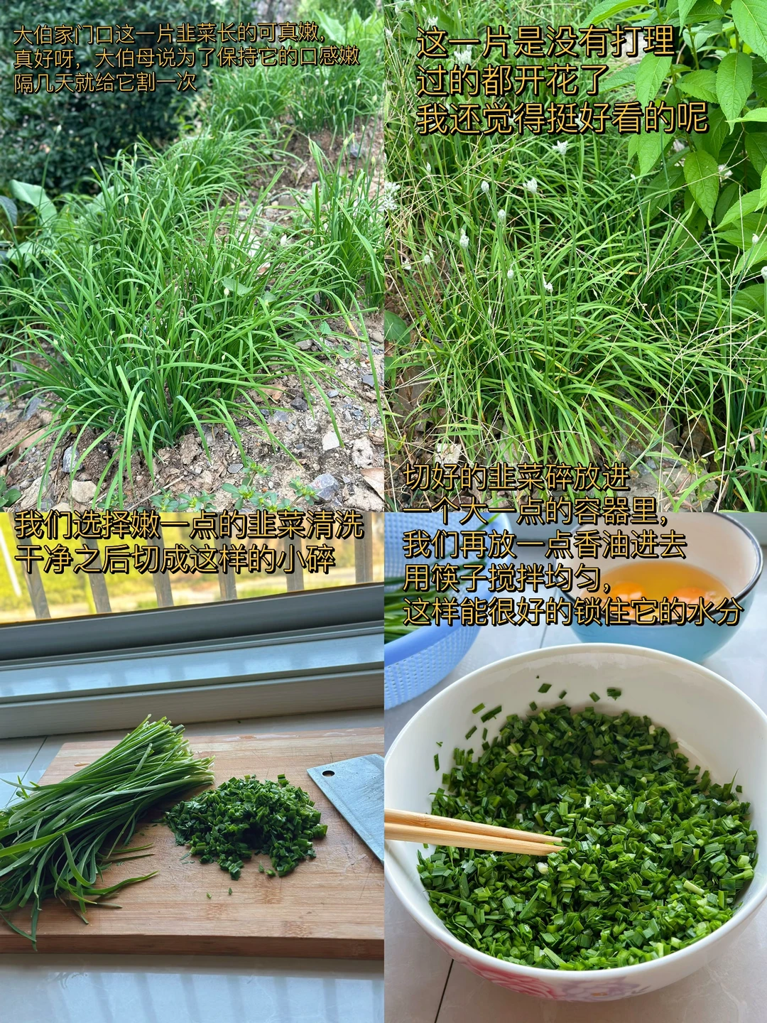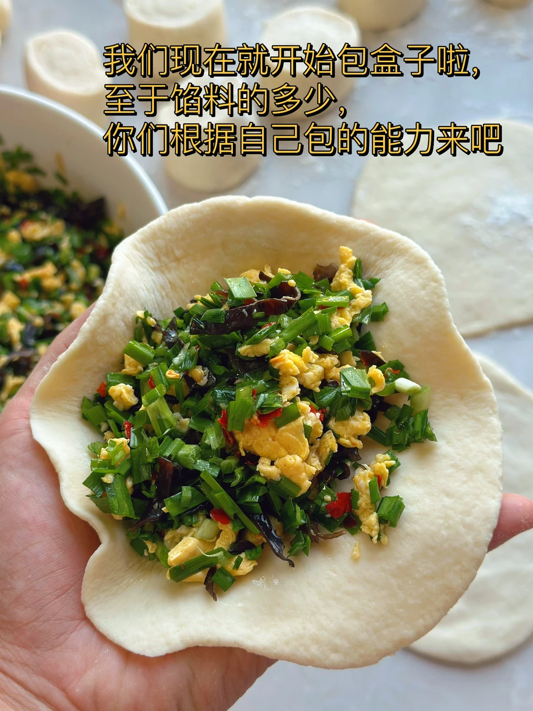 1. 大伯家门口这一片韭菜长的可真嫩,真好呀,大伯母说为了保持它的口感嫩隔几天就给它割一次 2. 这一片是没有打理过的都开花了我还觉得挺好看的呢 3. 我们选择嫩一点的韭菜清洗干净之后切成这样的小碎 4. 切好的韭菜碎放进一个大一点的容器里,我们再放一点香油进去用筷子搅拌均匀,这样能很好的锁住它的水分 5. 今天用的是土鸡蛋,蛋液打匀搅散油热把鸡蛋液倒进去,稍微成型的时候用筷子快速扒拉几下,然后马上熄火这样口感会很嫩哦 6. 为了口感更丰富一些,我还放了一些木耳碎进去,你们还可以再放一点虾皮我给忘记了,加入适量蚝油盐鸡粉,糖一丢丢白胡椒粉!喜欢吃辣的还可以放一些辣椒面进去哦,看着就很有食欲吧 7. 300克的面粉加入三克酵母加入一丢丢盐分成两半一半面粉用热水和面,放置微微热,另一半放凉水和面,然后合并在一起揉成一个稍微偏硬的面团发酵成两倍大小 8. 发酵好的面团我们拿出来给它揉一下排排气,然后改成一个大面皮从上到下卷起来成这样 9. 然后切成大小相等的剂子,然后像擀饺子皮那样擀成中间厚边缘薄的面片就可以 10. 我们现在就开始包盒子啦,至于馅料的多少,你们根据自己包的能力来吧 11. 捏成自己喜欢的褶子就可以,锅里放入少许油包好的盒子放进去煎至两面金黄就可以了喜欢酥脆的就可以多煎一会儿火别大啊