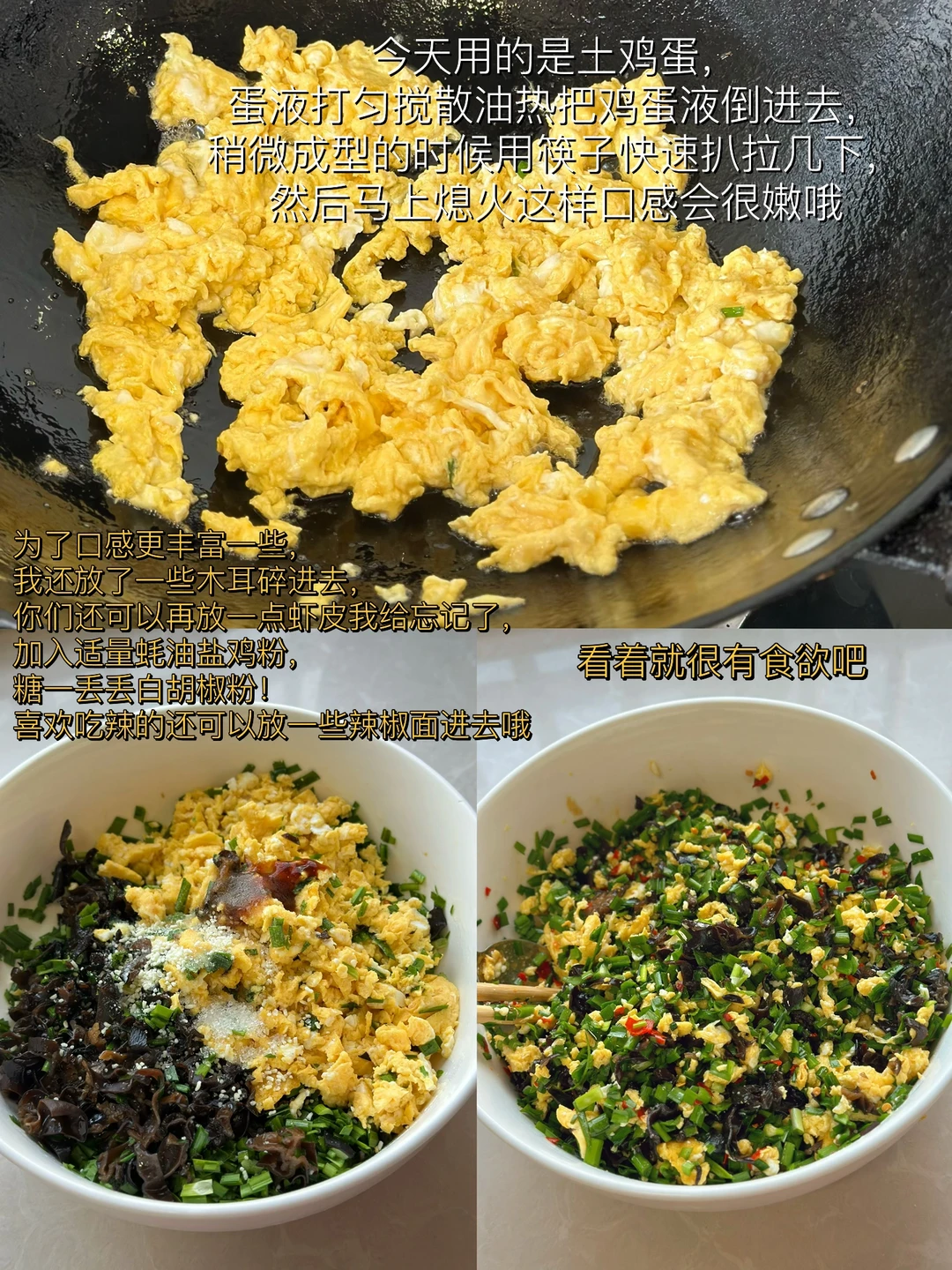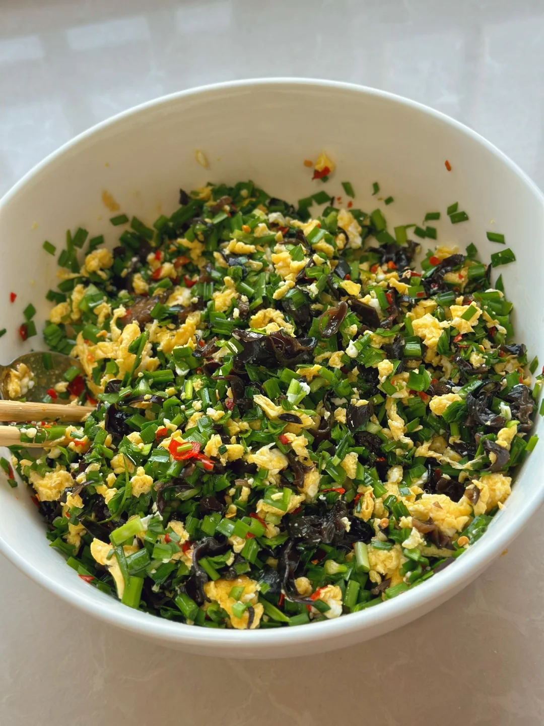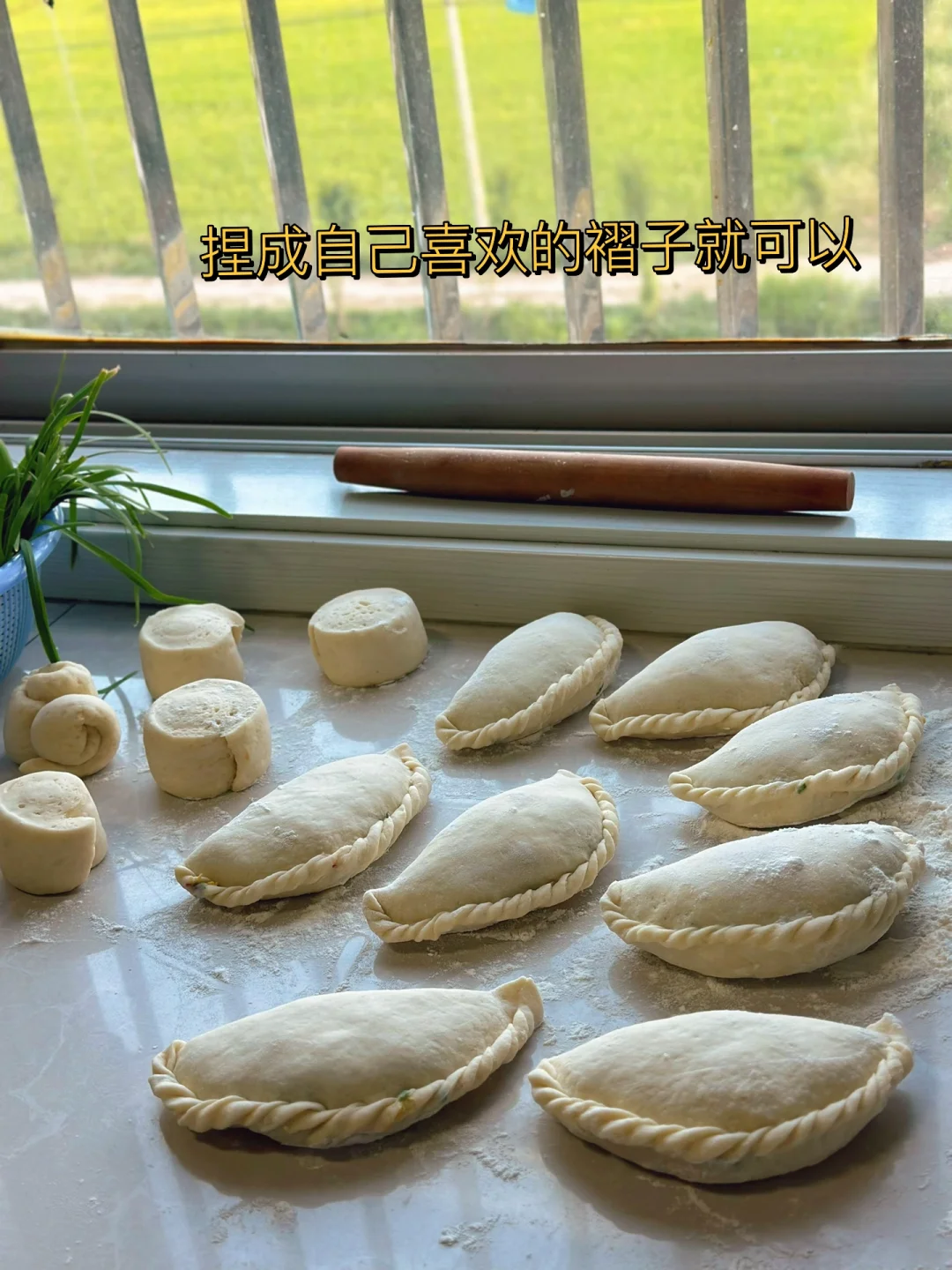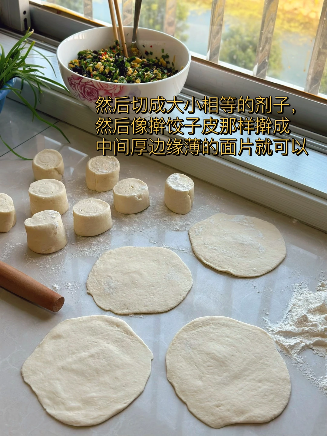 1. 大伯家门口这一片韭菜长的可真嫩,真好呀,大伯母说为了保持它的口感嫩隔几天就给它割一次 2. 这一片是没有打理过的都开花了我还觉得挺好看的呢 3. 我们选择嫩一点的韭菜清洗干净之后切成这样的小碎 4. 切好的韭菜碎放进一个大一点的容器里,我们再放一点香油进去用筷子搅拌均匀,这样能很好的锁住它的水分 5. 今天用的是土鸡蛋,蛋液打匀搅散油热把鸡蛋液倒进去,稍微成型的时候用筷子快速扒拉几下,然后马上熄火这样口感会很嫩哦 6. 为了口感更丰富一些,我还放了一些木耳碎进去,你们还可以再放一点虾皮我给忘记了,加入适量蚝油盐鸡粉,糖一丢丢白胡椒粉!喜欢吃辣的还可以放一些辣椒面进去哦,看着就很有食欲吧 7. 300克的面粉加入三克酵母加入一丢丢盐分成两半一半面粉用热水和面,放置微微热,另一半放凉水和面,然后合并在一起揉成一个稍微偏硬的面团发酵成两倍大小 8. 发酵好的面团我们拿出来给它揉一下排排气,然后改成一个大面皮从上到下卷起来成这样 9. 然后切成大小相等的剂子,然后像擀饺子皮那样擀成中间厚边缘薄的面片就可以 10. 我们现在就开始包盒子啦,至于馅料的多少,你们根据自己包的能力来吧 11. 捏成自己喜欢的褶子就可以,锅里放入少许油包好的盒子放进去煎至两面金黄就可以了喜欢酥脆的就可以多煎一会儿火别大啊