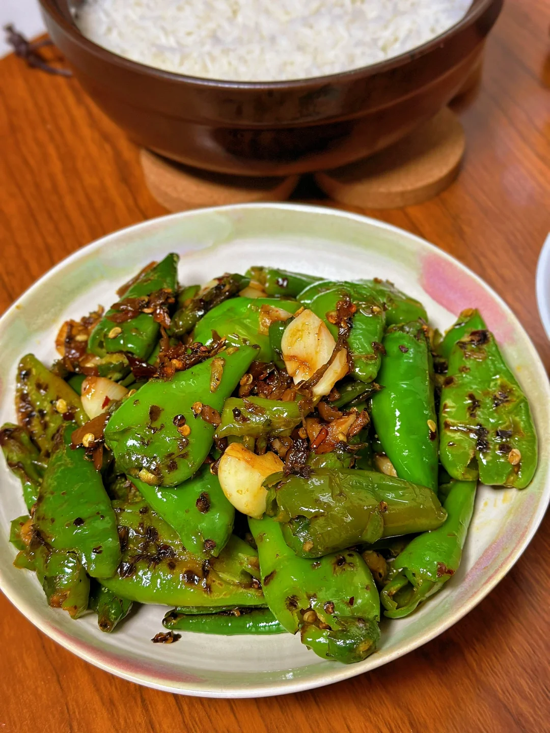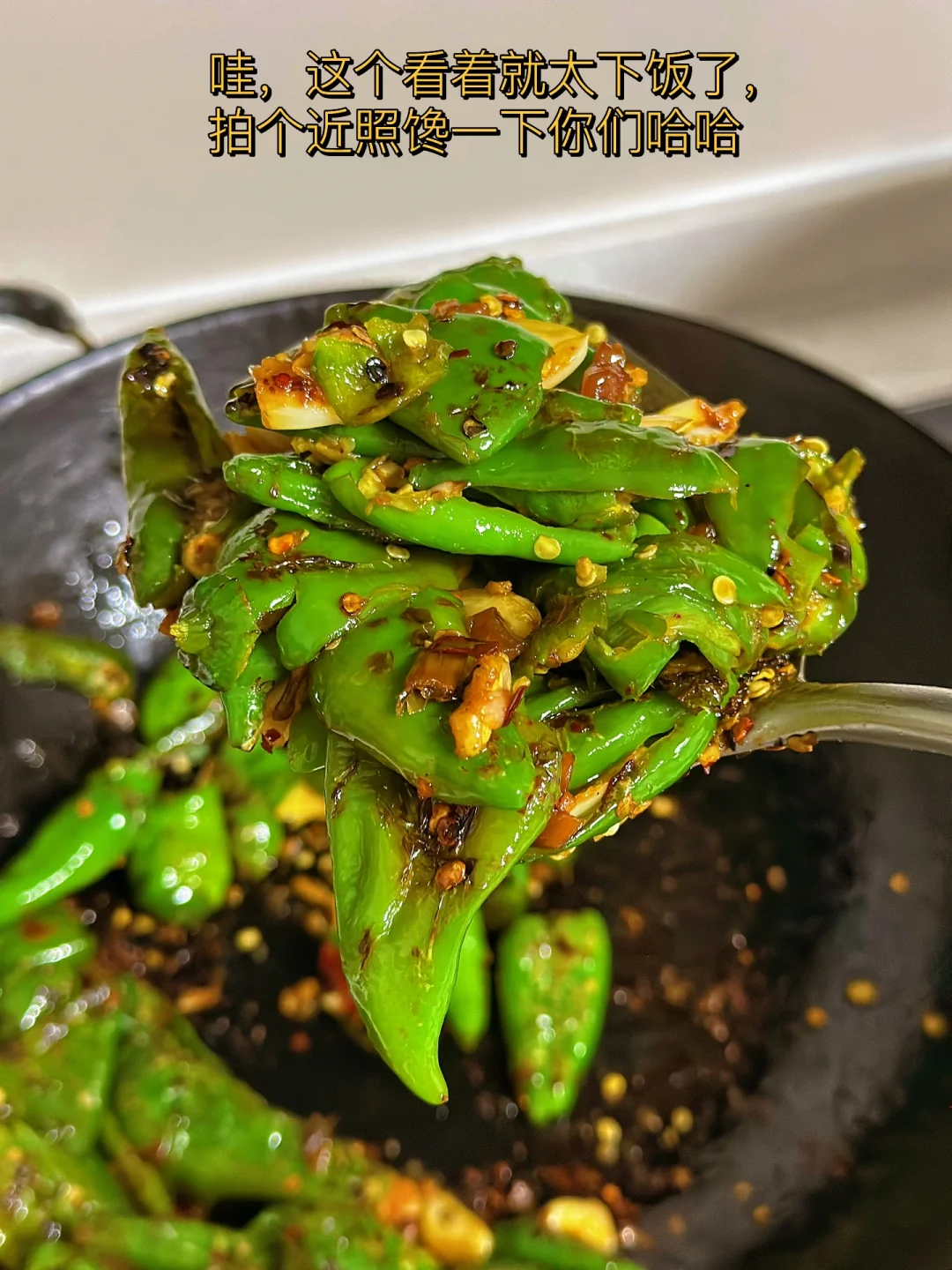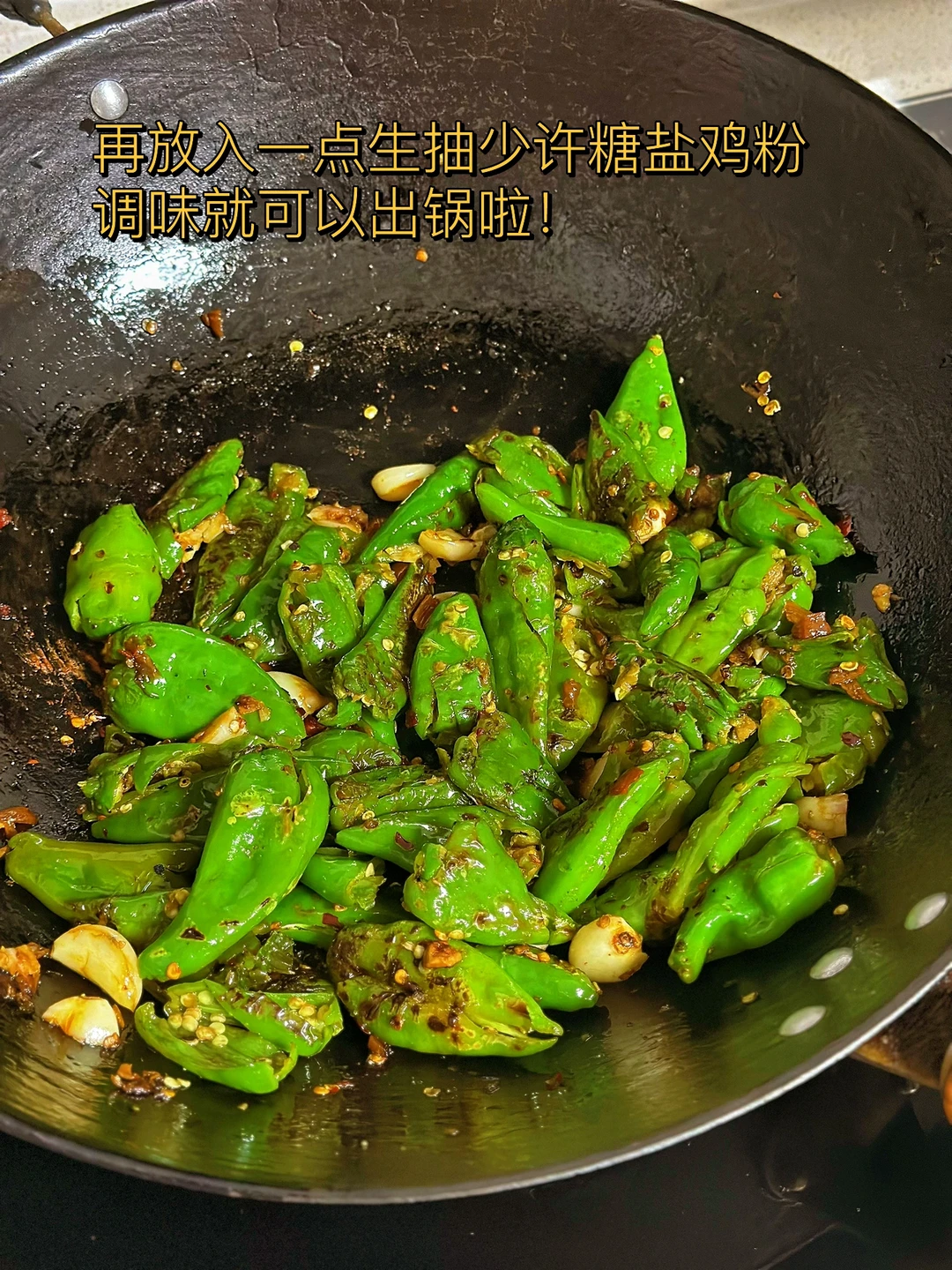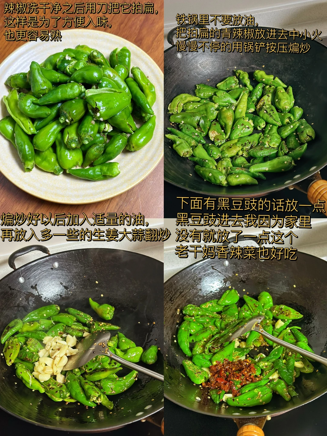 4. 铁锅里不要放油,把拍扁的青辣椒放进去中小火慢慢不停的用锅铲按压煸炒