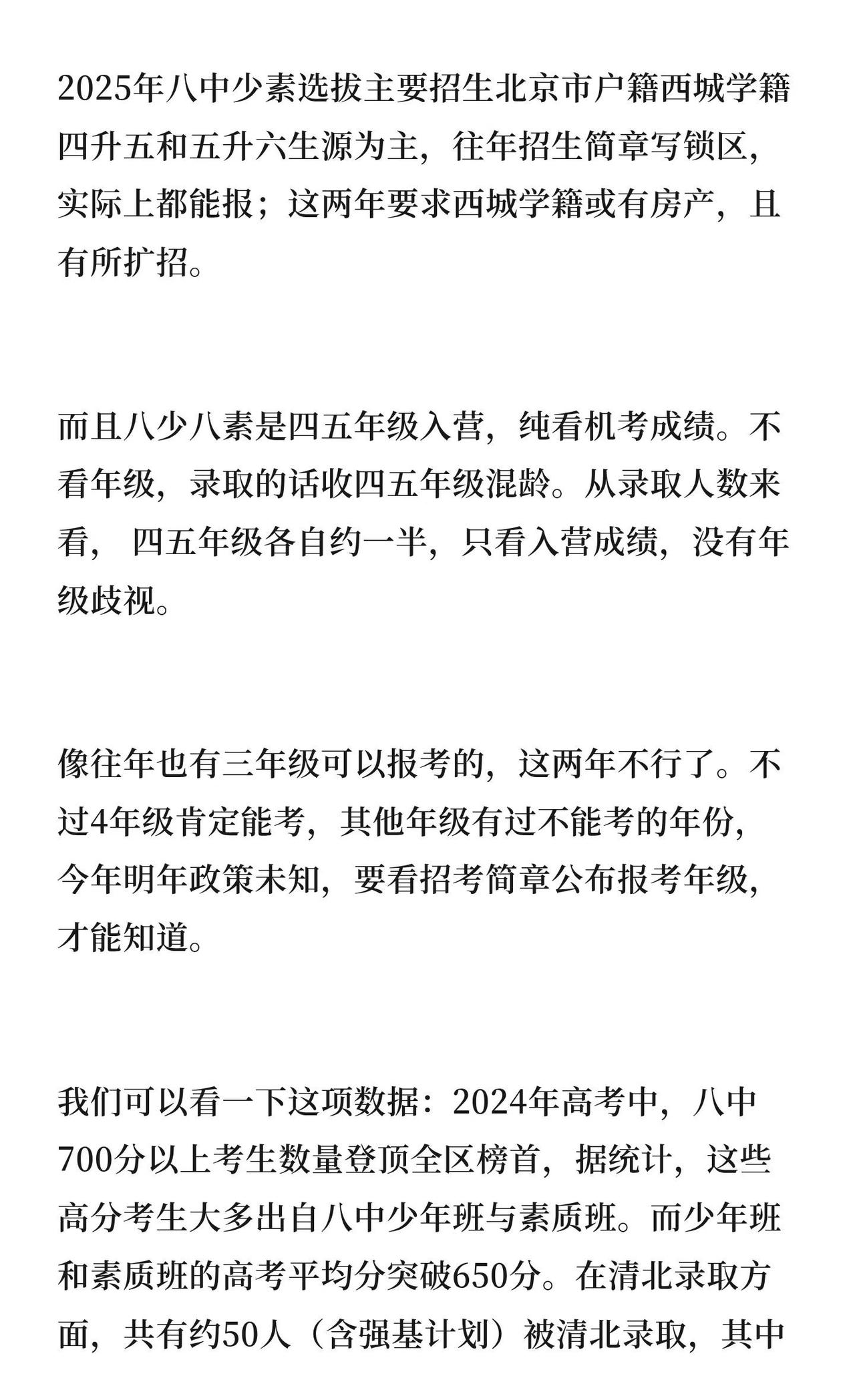 八少八素选拔"内部"信息 西城鸡娃 西城小升初 西城幼升小 北京八中 北京八中八