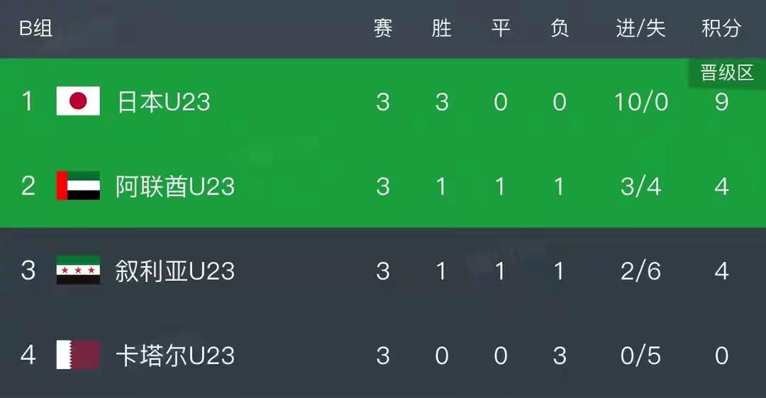 日本U23队2比0干净利落拿下卡塔尔,送卡塔尔3连败,送卡塔尔0进球回家,本届亚洲杯表现最差球队非卡塔尔莫属,曾经的亚洲杯冠军陨落,日本U23队3连胜晋级8强,日本进10球0失球,日本和越南是本届亚洲杯表现最好的球队。 另一场比赛,阿联酋1比1逼平叙利亚,2队同积4分,阿联酋凭据净胜球优势晋级8强,叙利亚惨遭淘汰,阿联酋也成了目前晋级8强的西亚独苗。 U23亚洲杯8强目前已晋级的6支球队是:越南、约旦、日本、阿联酋、乌兹别克斯坦、韩国。 今晚19:30,中国VS泰国,澳大利亚VS伊拉克,将决出U23亚洲杯最后2个名额,期待中国队拿下泰国第一名出线对韩国,让我们一起为中国队加油!