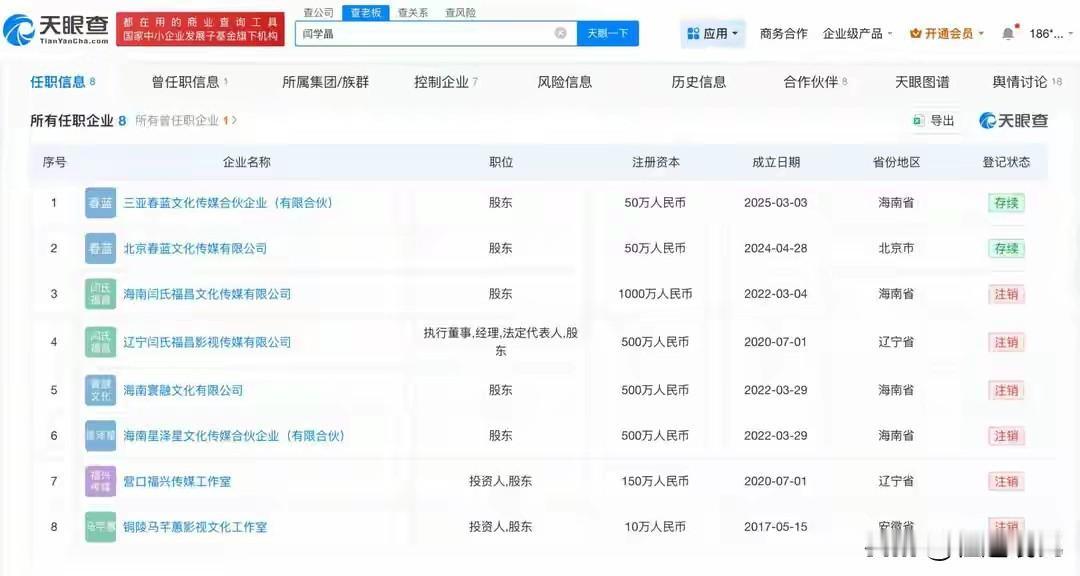 大家也很好奇,闫某晶名下共关联了8家公司,虽然目前只有两家企业续存,但是也有网友指出,作为军队文工团人员,怎么能创办这么多的公司? 其实闫某晶在2007年被海政文工团特招入伍,享受正师级待遇,但是到了2018年,海政文工团就撤编了,也就是说,闫某晶现在的身份已经和军人身份没有任何瓜葛了,所以创办公司这个事,应该没有啥问题。