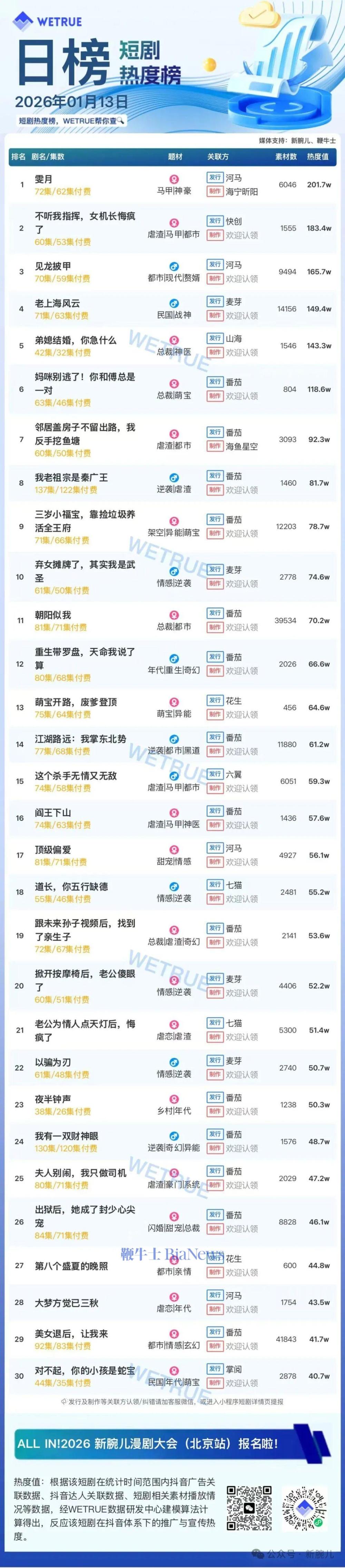 今天发布的是昨天(1月13日)短剧付费大盘日榜,整体大盘热度值为4179万。