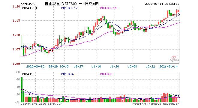 1月14日,自由现金流ETF800(563580)开盘跌0.51%,报1.179元。自由现金流ETF800(563580)重仓股方面,中国海油开盘涨0.88%,美的集团涨0.00%,格力电器跌0.05%,五粮液跌0.11%,中远海控涨0.13%,洛阳钼业涨0.22%,牧原股份涨0.02%,TCL科技涨2.31%,中国铝业涨0.93%,顺丰控股跌0.28%。