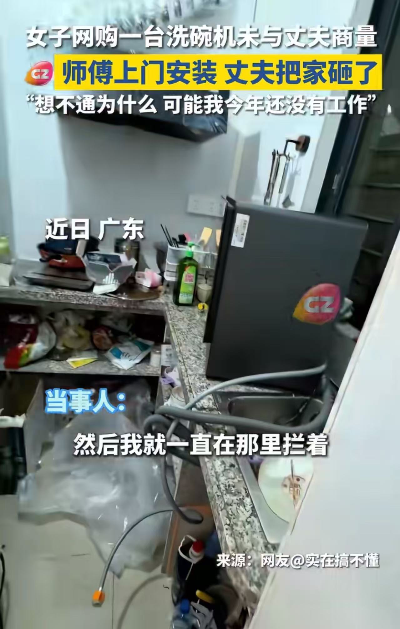 广东,女子网购一台洗碗机未与丈夫商量,师傅上门安装时,丈夫把家砸了。女子发视频哭诉:“想不通为什么,可能我今年还没有工作吧……”网友:他接受得了洗碗机,接受不了一个没工作天天在家连碗都懒得洗的人……