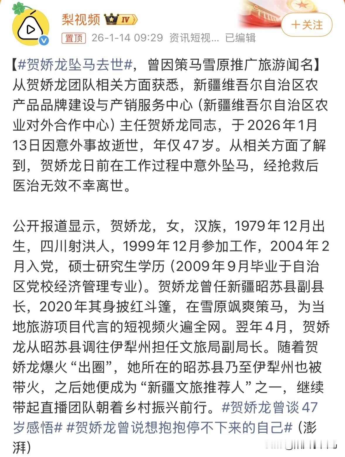从贺娇龙团队相关方面获悉,新疆维吾尔自治区农产品品牌建设与产销服务中心(新疆维吾尔自治区农业对外合作中心)主任贺娇龙同志,于2026年1月13日因意外事故逝世,年仅47岁。从相关方面了解到,贺娇龙日前在工作过程中意外坠马,经抢救后医治无效不幸离世。