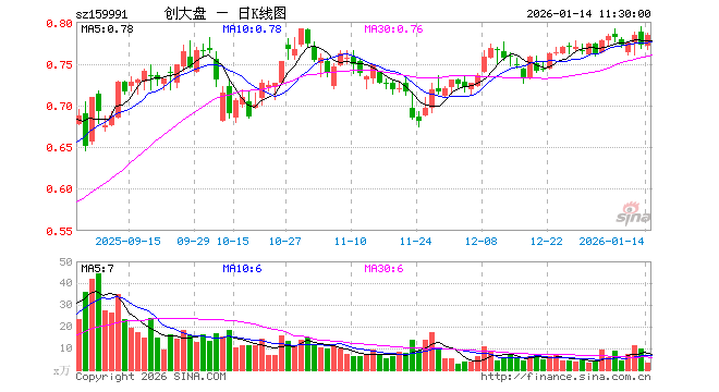 1月14日,截止午间收盘,创大盘ETF(159991)涨1.55%,报0.784元,成交额276.00万元。创大盘ETF(159991)重仓股方面,宁德时代截止午盘跌0.22%,中际旭创跌1.04%,东方财富涨4.82%,新易盛跌0.39%,阳光电源涨4.16%,胜宏科技涨0.97%,汇川技术涨1.86%,迈瑞医疗涨1.59%,亿纬锂能涨2.64%,同花顺涨9.33%。