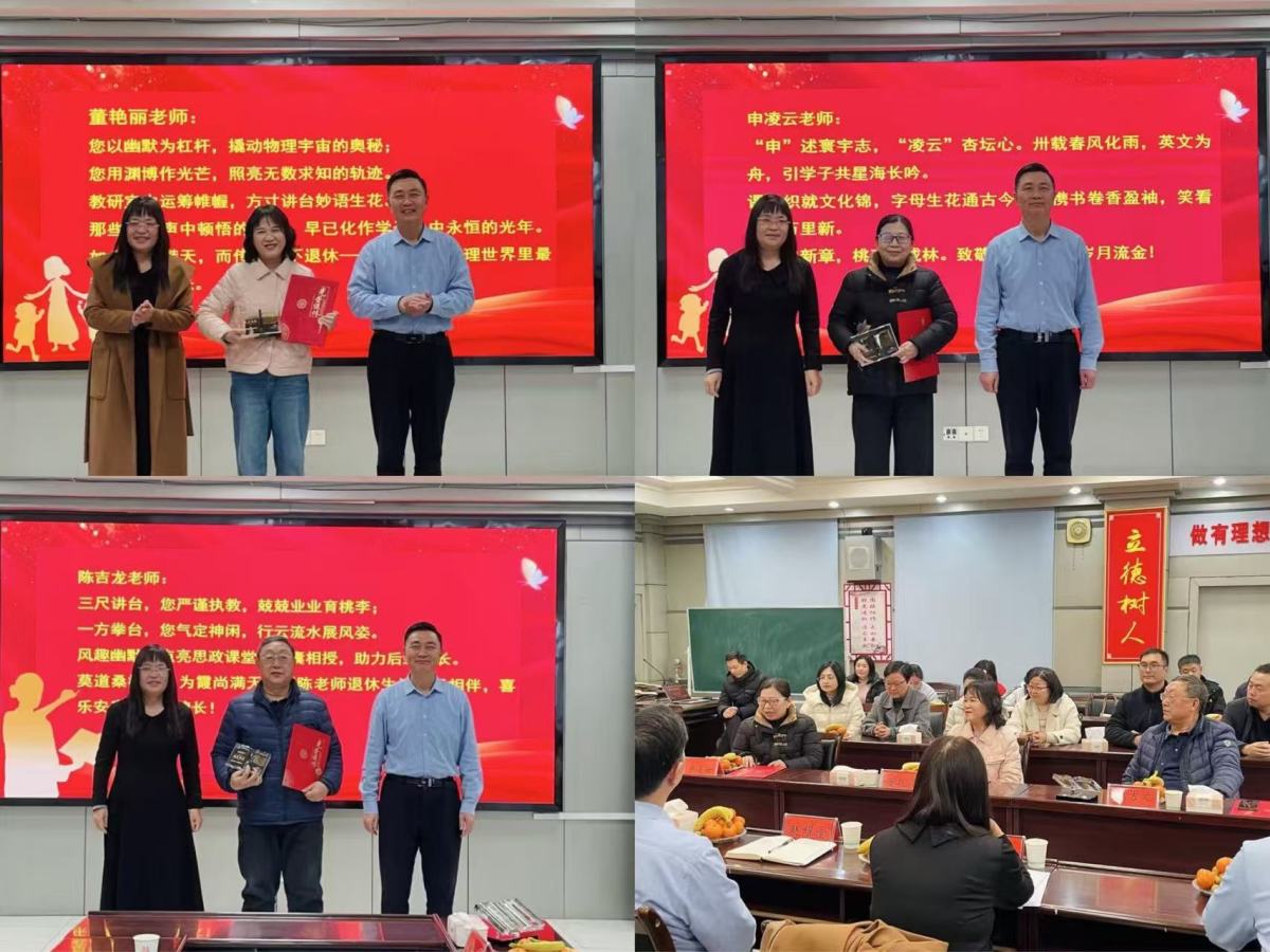 随后,党委书记赵耀堂与党委副书记、校长郭爱红共同为三位老师颁发荣退纪念品,奖杯与证书承载着全校师生对老教师数十年辛勤付出的认可与感念,定格下这段珍贵的教育情缘。