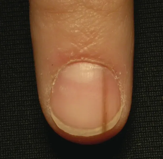 甲黑线也叫做线状黑甲,和上面的几种表现都不同,因为它是指甲盖上出现的褐色或黑色纵向条纹,可以从指甲根部延伸到远端。