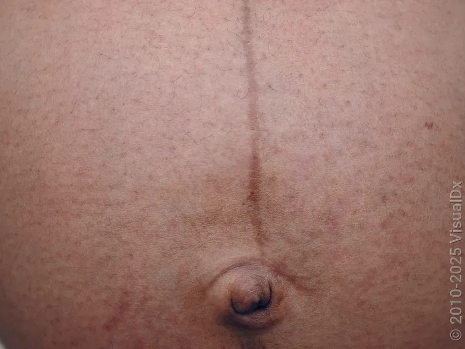 可以看到,正如上图所示,它表现为腹部正中线上的褐色或黑褐色条纹。它未必贯穿整个腹部,颜色的深浅也取决于个体本来的肤色。