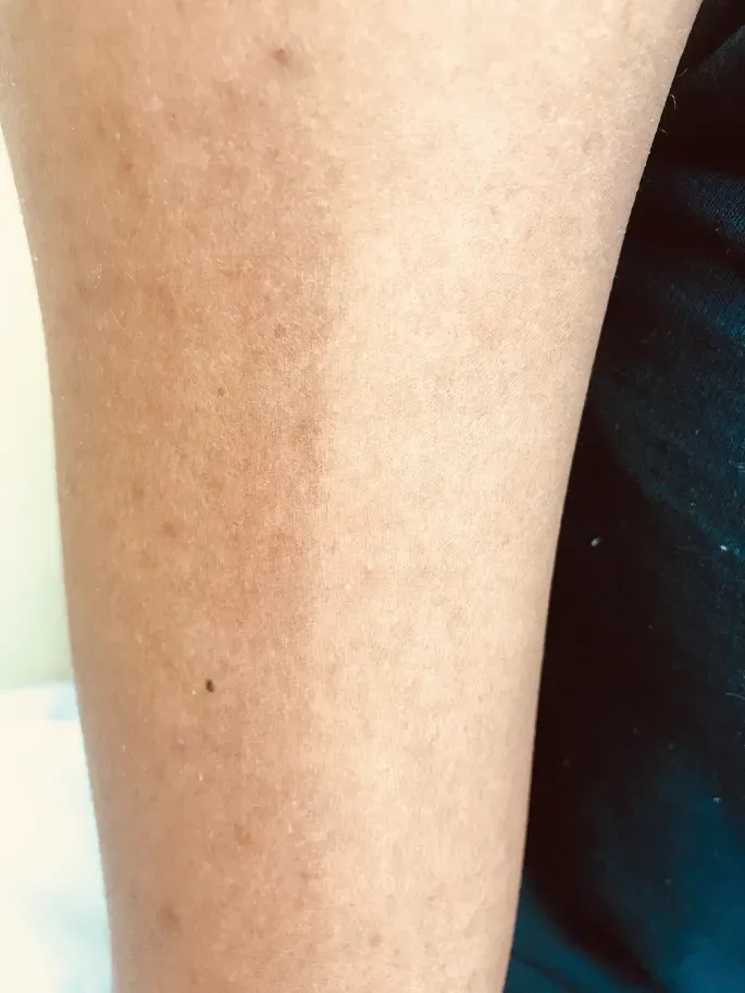 它一般是对称性、双侧分布,从图中可以看出,它的分界线非常清晰。这种对比在深色皮肤中更为明显,并且会因日晒或妊娠而变得更加清晰。