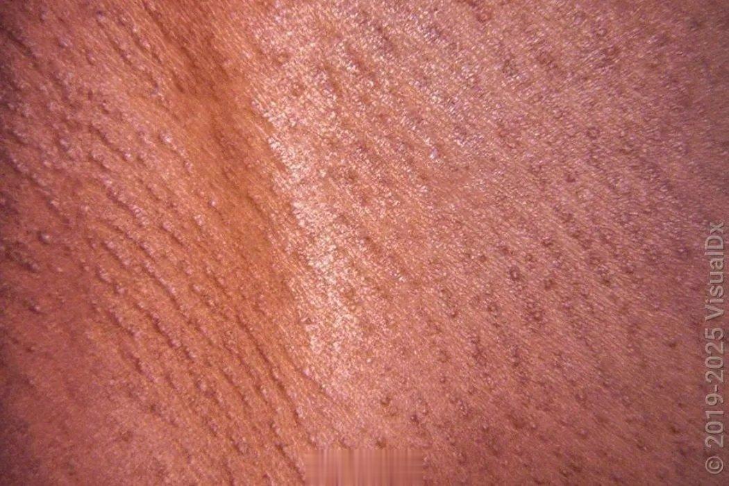 这种毛囊炎的特点是,以毛囊开口区域(也就是毛囊漏斗部)为中心,出现了慢性的炎症。突出的表现是大量、密集的肤色小颗粒,只有1、2毫米,放大镜下看起来是“鹅皮疙瘩”。