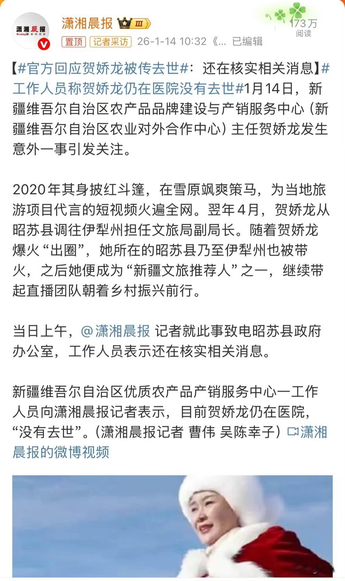 澎湃新闻这一次有点过分了吧?正规媒体没有最终核实就抢着报道贺娇龙意外事故逝世了,