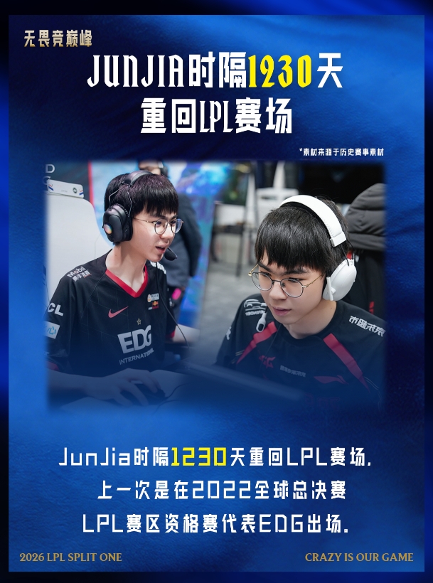 时隔1230天Junjia重返LPL赛场,上一次是在S12 LPL赛区资格赛代表EDG出场