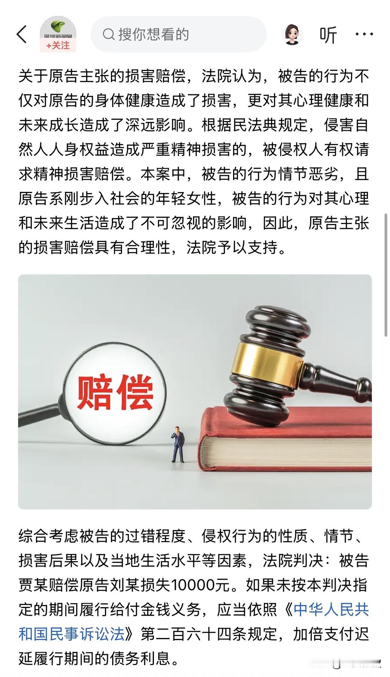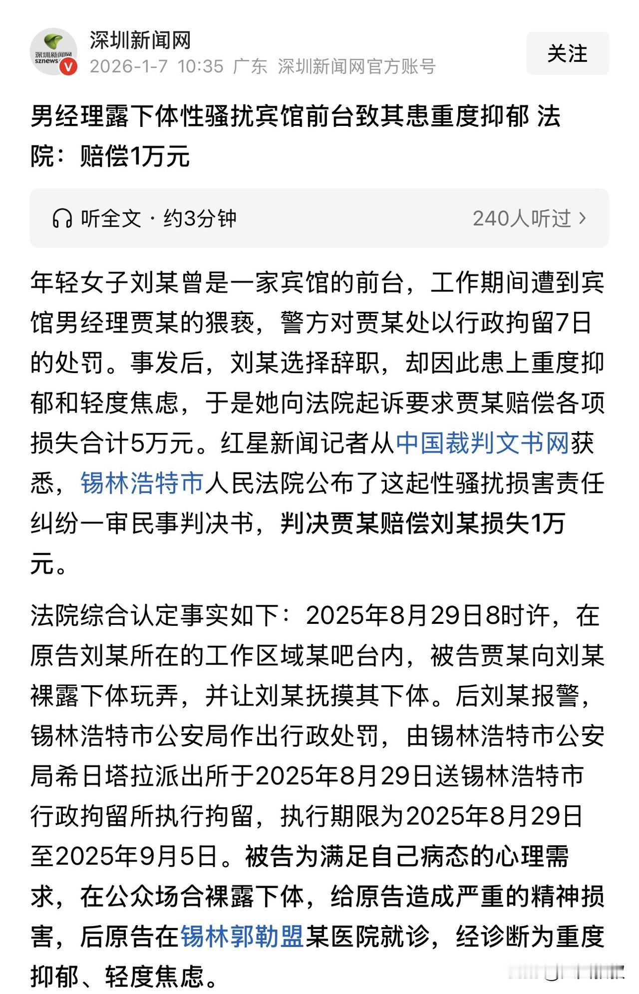 内蒙古,一女子为宾馆前台,因为长得年轻漂亮被男上司看上,趁着早上四周无人,男上司直接露出下身让女子看,女子当即报了警,事发后,男上司被处以行政拘留处罚,而女子因此事被诊断为抑郁,随后,女子将男上司告上了法院索赔5万元。 据悉,女子刘某刚刚步入社会,就应聘到一家宾馆从事前台工作,因为自己长得年轻又漂亮,所以经常有房客向自己索要联系方式,刘某对此也习以为常。 然而,看上刘某长相的不仅仅是入住的房客,就连宾馆的男同事也都觉得刘某好看,其中就包括男经理贾某。 25年8月29日的这天早上,刘某刚刚来上班就碰到了贾某,谁知趁着四周无人,贾某直接露出了下身让刘某看看,这一下把刘某吓得大叫起来,当即刘某就报了警。 事发后,警方将贾某予以了行政拘留,而刘某经历了这次惊吓后,开始变得抑郁寡欢起来,此后,刘某多次去医院就诊,最终被确诊为抑郁症,为此,刘某也离了职。 因为这件事情,让刘某患病不说,还没了工作,气愤之余,刘某决定追究贾某的民事赔偿责任,于是,刘某将贾某告上了法院索赔5万元。 事发后,有网友说,以前在工地干活,碰到一个十三四孩子,整天光着身子在工地上溜达,还好没有人告他,不然赔大了。 对此有网友反驳称,人家才是个十三四孩子,这是个成年人,还是宾馆的经理,能一样吗,成年人要为自己的行为负责。 在贾某已经承担行政拘留的责任后,还能再承担民事赔偿吗? 治安管理处罚法规定,违反治安管理行为对他人造成损害的,除依照本法给予治安管理处罚外,行为人或者其监护人还应当依法承担民事责任。 所以,即便贾某承担了行政拘留责任外,不影响他承担民事赔偿责任,所以,刘某有权起诉要求贾某赔偿自己的损失。 民法典第一千一百七十九条规定,侵害他人造成人身损害的,应当赔偿医疗费、护理费、交通费、营养费、住院伙食补助费等为治疗和康复支出的合理费用,以及因误工减少的收入。 一般而言,贾某要承担的赔偿项目是上述合理的费用,但是,因为贾某的行为,导致了刘某患上抑郁症,而且是精神方面的,因此,贾某还需要赔偿刘某精神损失费。 最终经过法院的核算,认定刘某的损失为1万元,据此判决贾某赔偿刘某一万元。 其实,这个一万元,不仅包括精神损失费、医疗费、误工费,还包括刘某因维权而支出的合理费用,抛去合理费用,支持的损失也就在几千元,对贾某来说,一次冲动的行为,最终换来的是6天的拘留外加1万的赔偿,这又是否值得? 对此,你对本案有什么看法? —————————— 关注我,带你评析法律热点,关注冷暖人生。 文章原创,抄袭必究