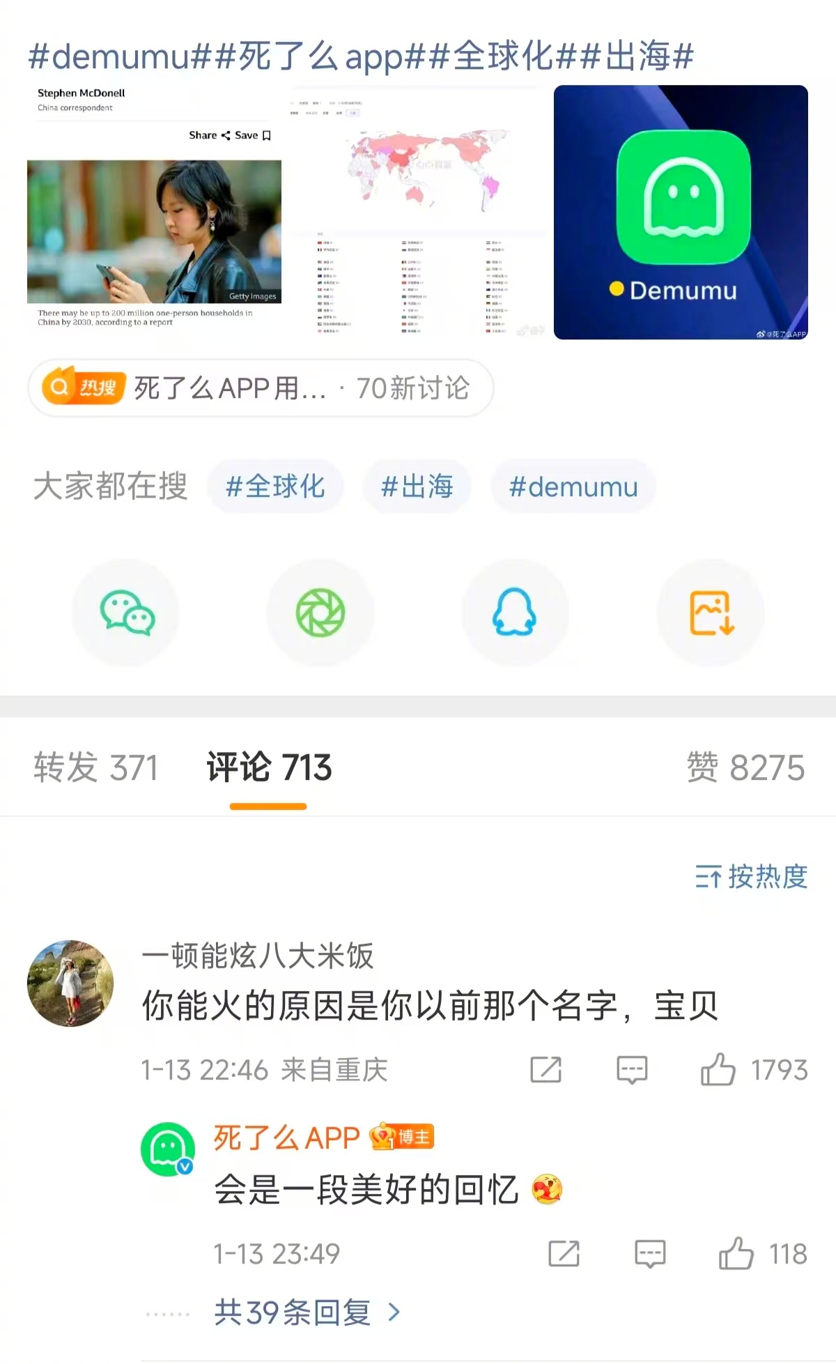 #死了么APP创始人称目前是发展关键时期#1月13日,独居安全工具类APP“死了么”官方发布公告,宣布新版本将正式启用全球化品牌名“Demumu”,原名称将逐步停用。据悉,该APP此前因服务独居群体的定位及独特名称引发广泛关注,近期获BBC报道后,海外市场实现爆发式增长。