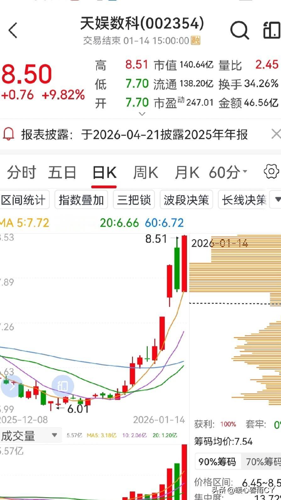 今日A股收盘:上证指数午后经历两波小跳水行情,走势转弱,从4190.87的高点回落,最终于4126.09收盘,跌幅0.31%。 今日A股资金明显流向成长赛道,计算机应用、通信设备、传媒板块备受资金青睐,人工智能与数字基建领域资金介入迹象明显,成为市场核心主线。 与此同时,银行、水电、通用机械板块遭遇资金流出,基本面50、上证180、上证央企等权重指数同步承压。 上证A股大盘指数收出穿头破脚小锤子阴线,自底部上涨已达19个交易日,明后两天进入变盘敏感窗口(21个交易日是 斐波那契“神奇数字”之一)短期震荡概率上升。 我的持仓股天娱数科,早盘低开后一路强势上涨直至涨停,表现十分亮眼。午后随大盘同步经历两波小跳水回落,但资金承接力较强,最终收收盘逼近涨停。换手高达34.26%,大概率将迎来短期调整。 自嘲一句:或许是老天心疼我天天喂养流浪猫,特意给的爱心奖励……股民的快乐就是这么简单,踩对节奏,利好加持,连空气都是甜的。 上证指数 股票收盘点评 冬日生活打卡季