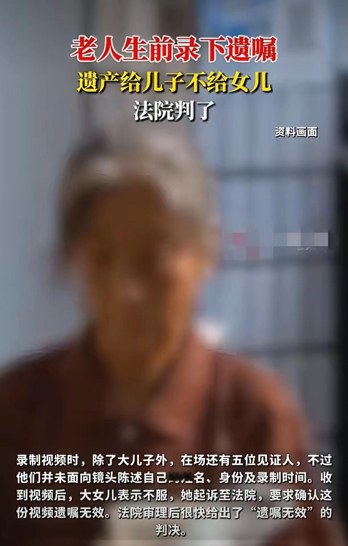 “父母口中的一视同仁,关键时刻都是偏向儿子的!” 养老是,女儿和儿子同等,不然就是白养这个女儿了,过分点就骂:“老话说得对,嫁出去的女儿泼出去的水。” 老人生前留下视频遗嘱,留下的现金都留给大儿子和二儿子,不给女儿半毛。 给出的理由完全站不住脚:说女儿在赡养期间,属于消极怠工,可以理解为被虐待,导致他身体遭受很大伤害,所以取消她的继承权。 两个儿子,把他照顾极好,可以理解为“过上皇帝的完美生活”。 儿子既然这么完美孝顺,为何在被女儿虐待时,儿子不阻止?按照我国法律法规,虐待老人是犯法的。 在视 频遗嘱中,只有大儿子一个人在现场,其他人几个人,并没说明自己是谁,名字身份和时间。 这不得不让人阴谋论了:是不是两个儿子商量好了,不想让自己姐妹分遗产。以至于,让老父亲在清醒的时候就录制了这个视 频遗嘱。 好在,法院判这个遗嘱无效。 女儿赢回了她应有得的继承权。 男女平等,养老男女一样,往往都会被当头一棒,女儿永远是被牺牲的一方。