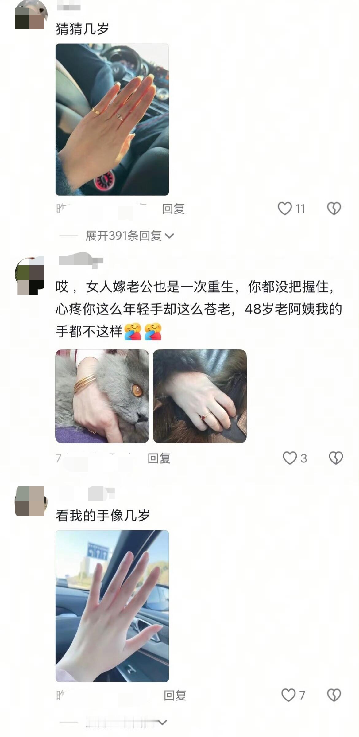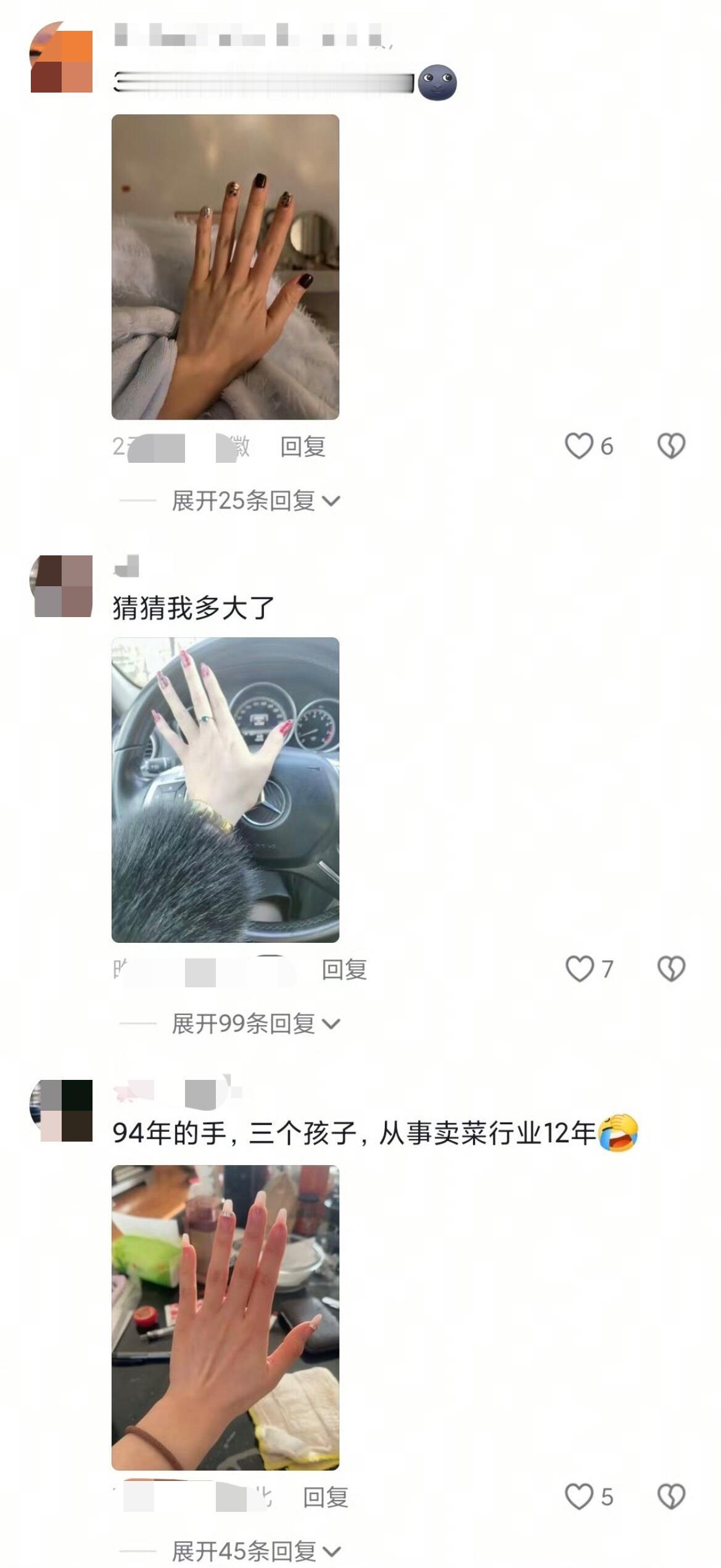在别人的苦难面前秀优越….何不食肉糜! 近日,刷到一个视频,视频中是一位来自四川大凉山的26岁姑娘,她说26岁的她,手却像七八十岁老奶奶的手一样! 结果评论区很多人都在秀自己的手,然后让人猜多少岁…. 我看这视频第一反应就是在想这姑娘的工作,是不是种大棚的,这手看着都好痛,心疼!但实在无法理解评论区里莫名其妙的晒手是什么意思,真见!